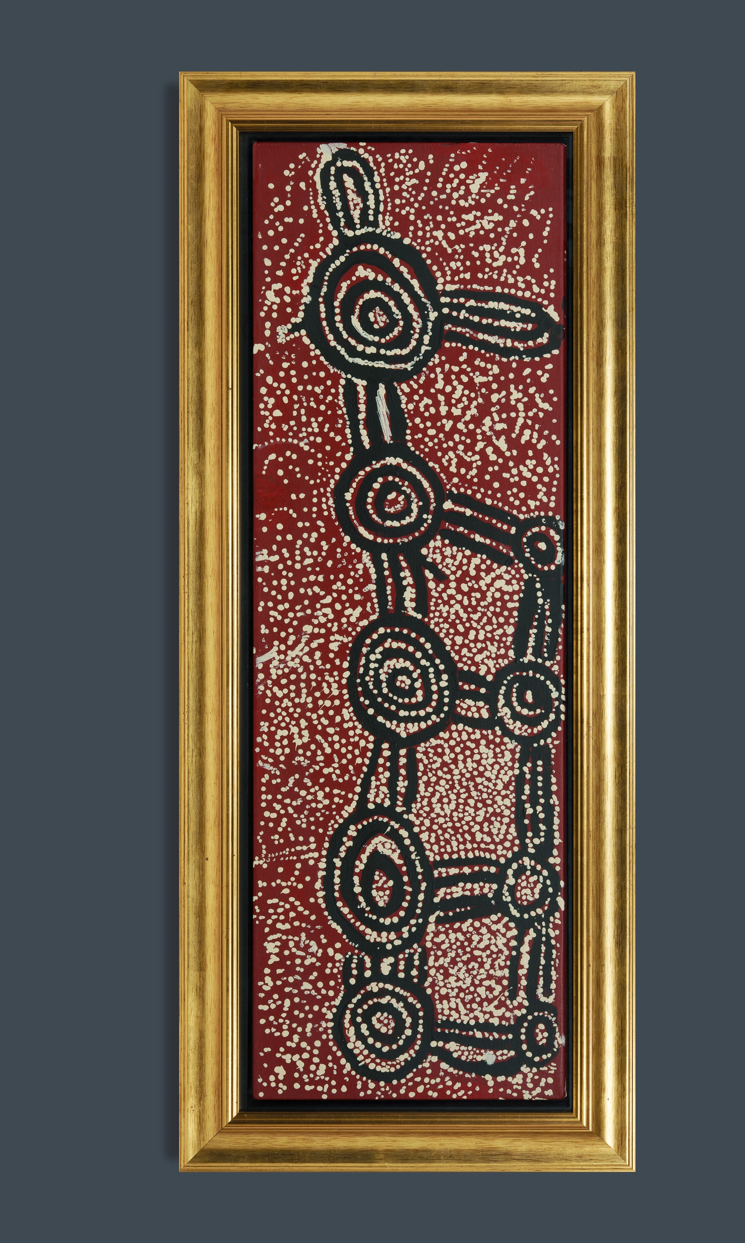 TJAMPITJINPA, Pegleg (Aboriginal 1920-2006) Untitled, 2002. Inscribed verso with artist's name and cat #PL200210. Acrylic on Linen 112x36cm PROVENANCE: Yanda Aboriginal Art, NT (stamp verso); Ken Hinds Cultural Heritage Collection, Qld.Estimate $800-1,500