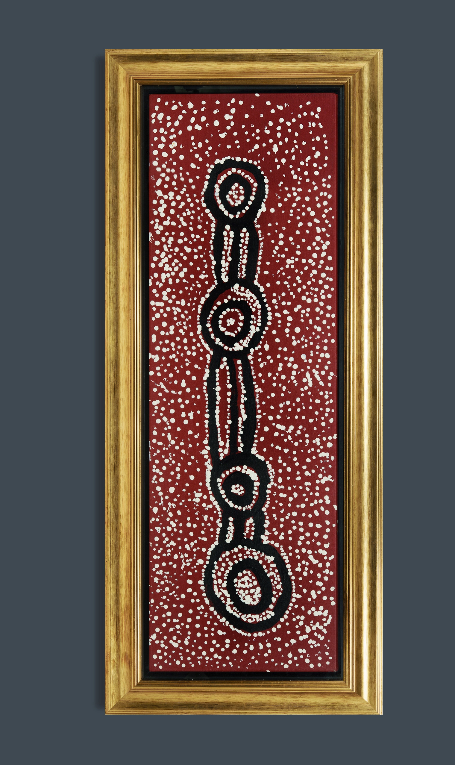 TJAMPITJINPA, Pegleg (Aboriginal 1920-2006) Untitled, 2002. Inscribed verso with artist's name and cat #PT200203. Acrylic on Linen 112x36cm PROVENANCE: Yanda Aboriginal Art, NT (stamp verso); Ken Hinds Cultural Heritage Collection, Qld.Estimate $800-1,500