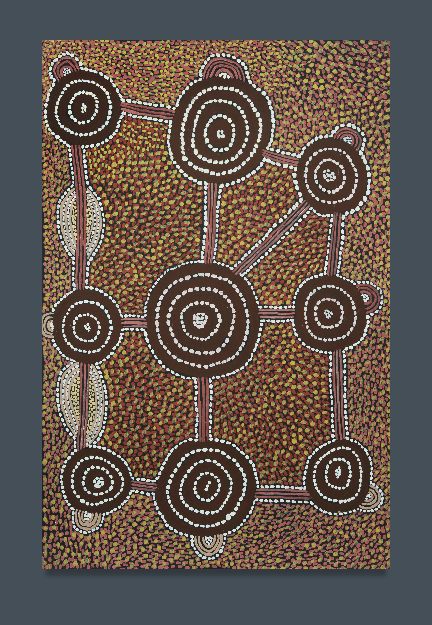 Attrib. TJANGALA, Uta Uta (Aboriginal 1926-1990) 'Walukirritji - Fire and Possums,' c.1980. Inscribed with title verso. Acrylic on Canvas 126x83cm PROVENANCE: Private collection, USA; Sotheby's, Melbourne, November 15th 2005 (lot 344); Ken Hinds Cultural Heritage Collection, Qld.Estimate $600-1,000