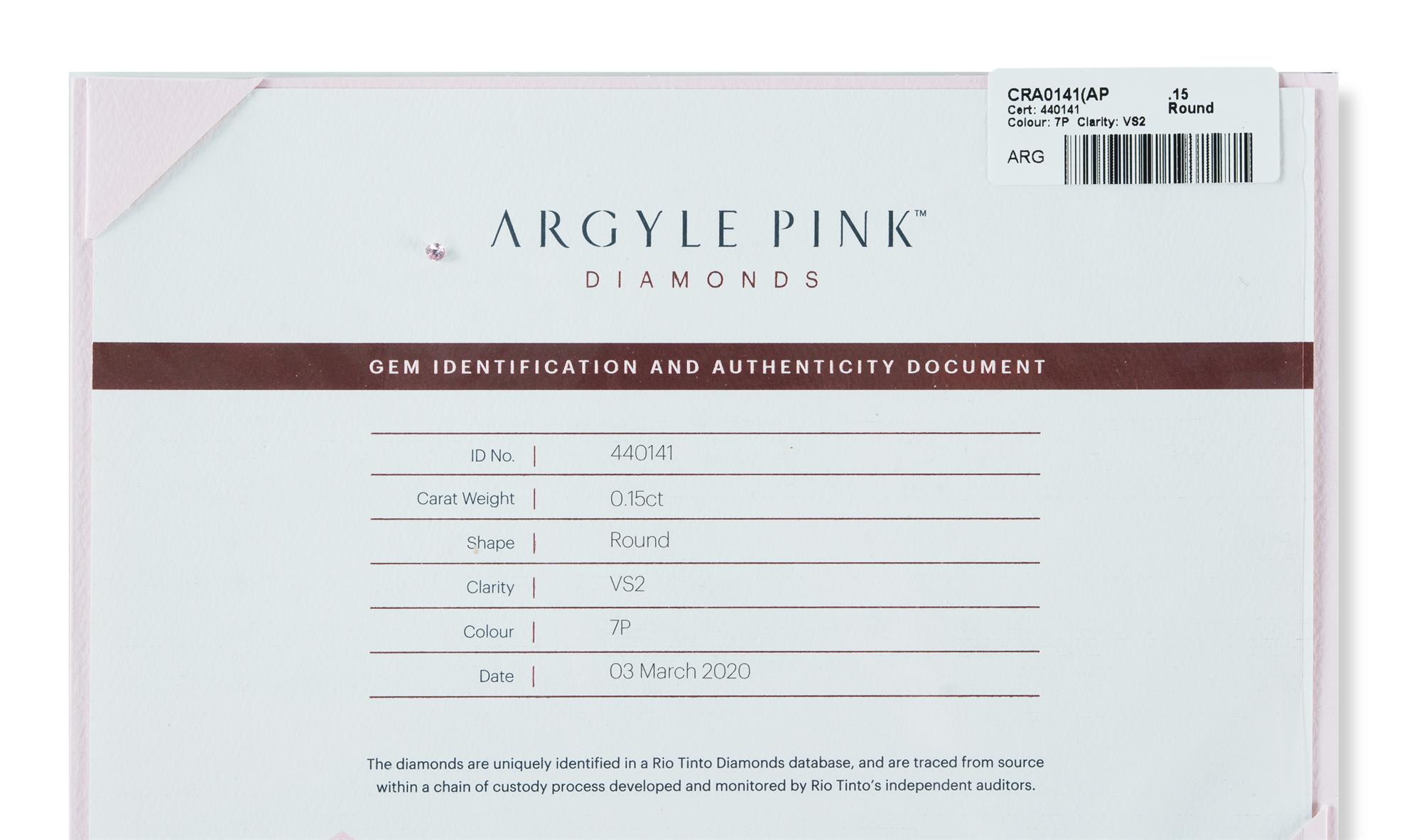 Argyle Pink Diamond 0.15ct Argyle pink diamond with colour 7P and clarity VS2. Includes Argyle certificate and laser-inscribed lot number 440141.Estimate $6,000-10,000