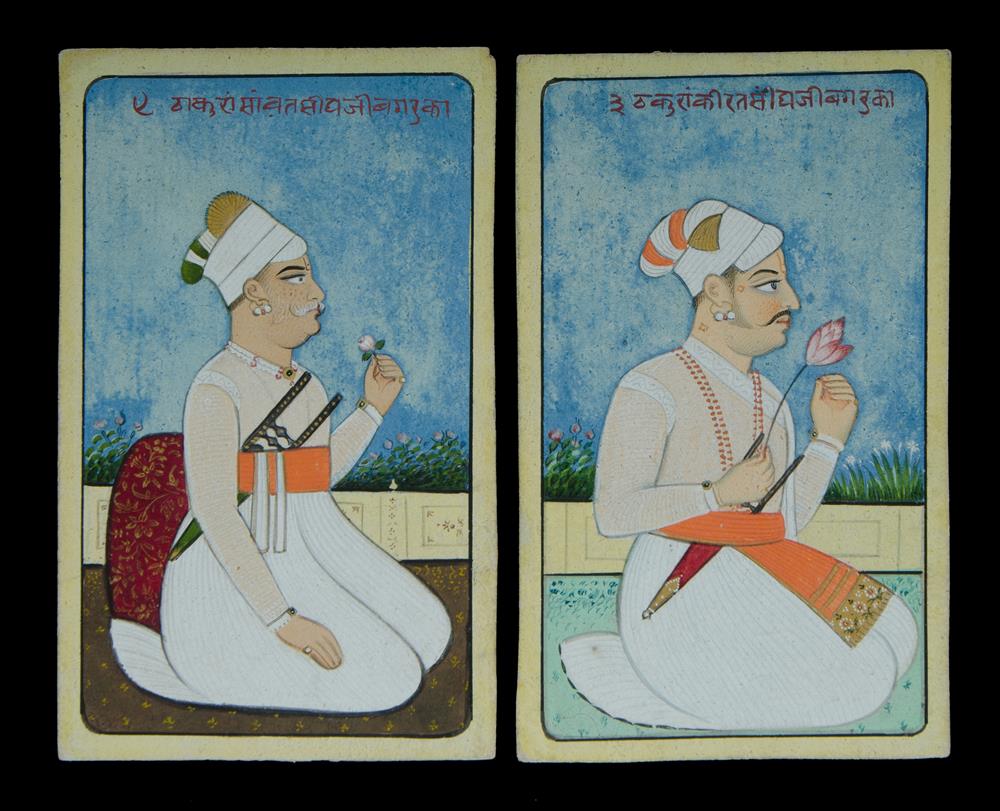 8 Portraits of Indian Emperors. 7 inscribed verso as representing personages from Bagroo (Bagru, Rajasthan) Gouache, Ink & Gilt on Card (8) 11x6cm (each) Estimate $500-700