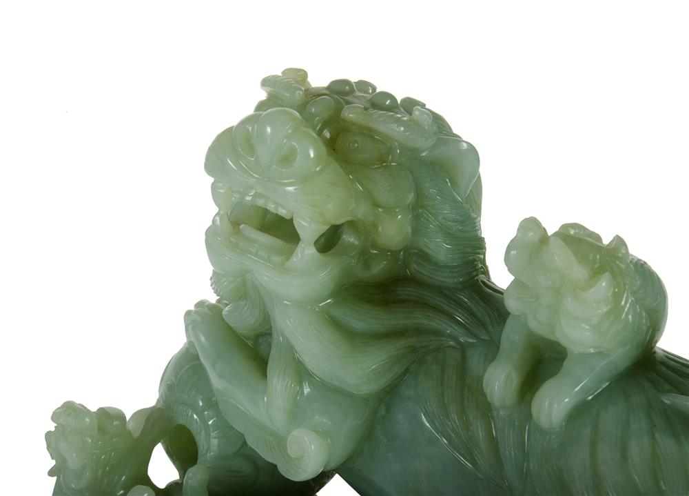 Chinese Jade Guardian Lion and Cubs. Well carved guardian lion with ball & two playful cubs, on a fitted wooden base. H12cm (figure only) Estimate $300-500