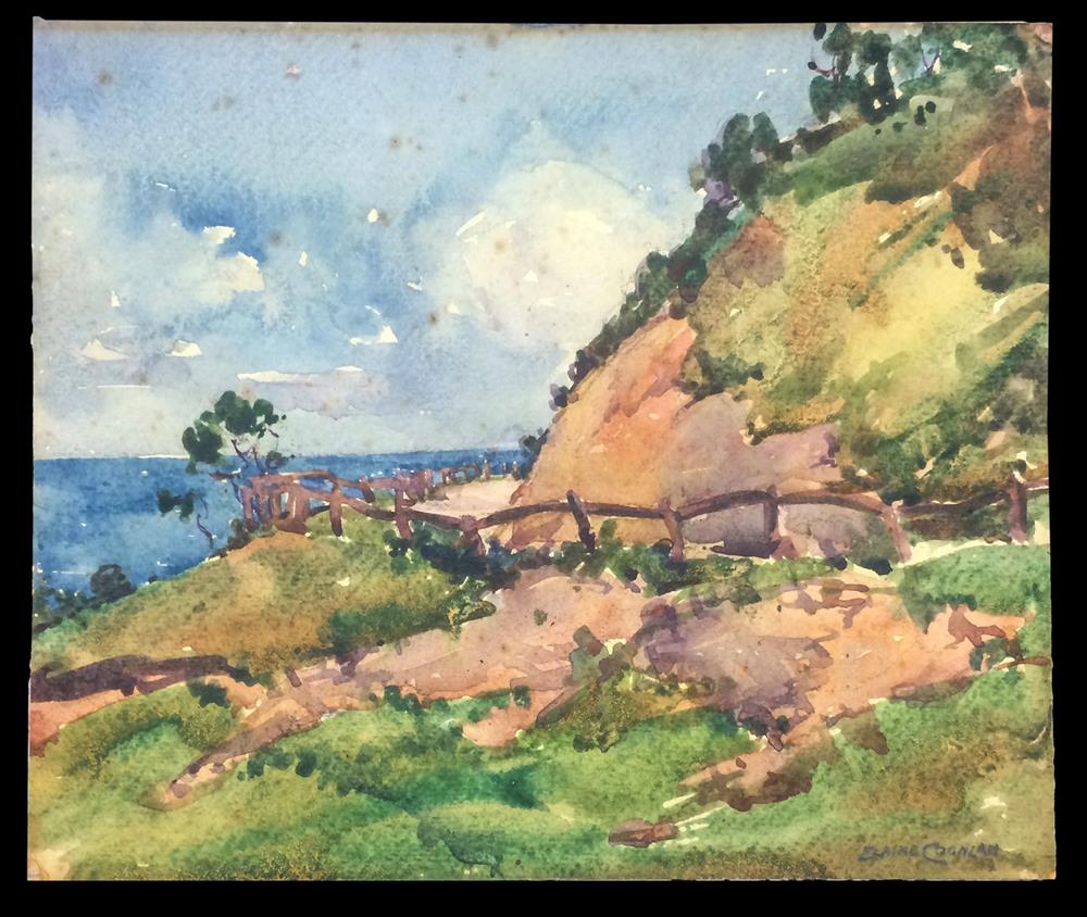 COGHLAN, Elaine (1897-1989) (2) Coastal Road (22.5x26.5cm); & Ocean Glimpsed Through the Trees (23.5x18cm) Provenance: Angeloro family collection. W/Clr (2) Estimate $100-200