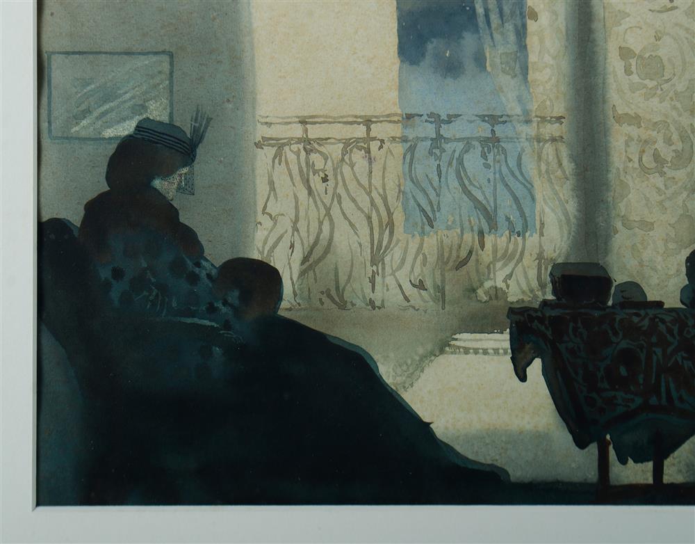 YOUNG, William Blamire (1862-1935) Interior with Veiled Woman Faintly signed lower left. W/Clr 26x35cm Estimate $800-1,500