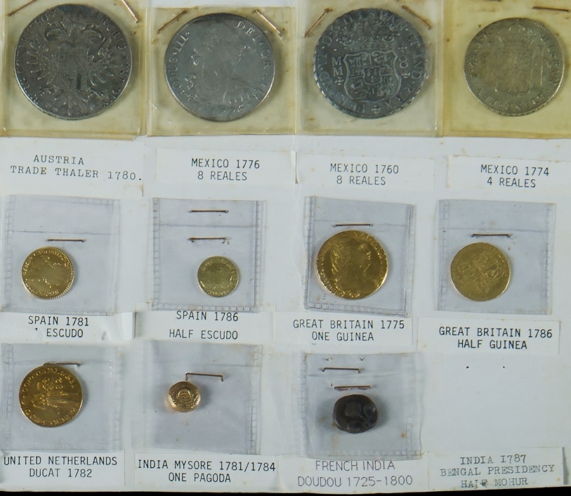 46 Various Proclamation Coins. Great Britain 1743 Crown; Netherlands 1766 Ducaton; Austrian Netherlands 1 Kronenthaler 1768; Austria Trade Thaler 1780; Mexico 8 Reales 1776; Mexico 8 Reales 1760; Mexico 4 Reales 1774; Mexico 2 Reales 1783; Spain Half Reale 1773; Spain 1 Reale 1781; Spain 2 Escudos 1788; Spain 1 Escudo 1781; Spain Half Escudo 1786; Great Britain 1775 One Guinea; Great Britain 1786 Half Guinea; Great Britain 1762 One Guinea; Brunswick-Luneberg 1753 (Hanover after 1814) One Gold Gulden; Brazil 6400 Reis 1784; Portugal 1778 1,000 Reis; United Netherlands Ducat 1782; India Mysore 1781/1784 One Pagoda; French India Doudou 1725-1800; Great Britain 1745 One Shilling; Great Britain 1787 One Shilling; Great Britain 1787 Sixpence; Great Britain 1763 Threepence; Great Britain 1772 Halfpenny; British Sumatra 1786 Three Keppings; Netherlands 1786 One Gulden; Netherlands East Indies 10 Stuiver; Netherlands East Indies 5 Stuiver 1758; Netherlands India Ceylon Stiver 1783; Netherlands Java Rupee 1783; India Madras Presidency Rupee (mill edge) 1758; India Assam Rupee 1771; Portugeses India Fanam One Atia 1768; French India Fanam (1/5 Rupee) 1738; India Jodphur Rupee 1780; Netherlands 1 Rijksdaalder 1770; Austria 1770 Twenty Kreuzer; India Bengal Pres Rupee 1787; Portugal 1736 Five Reis; Great Britain Farthing 1754; British Sumatra 1 Keffing 1783; Brazil 1787 320 Reis; & Netherlands East Indies One Duit 1754. Estimate $3,000-4,000