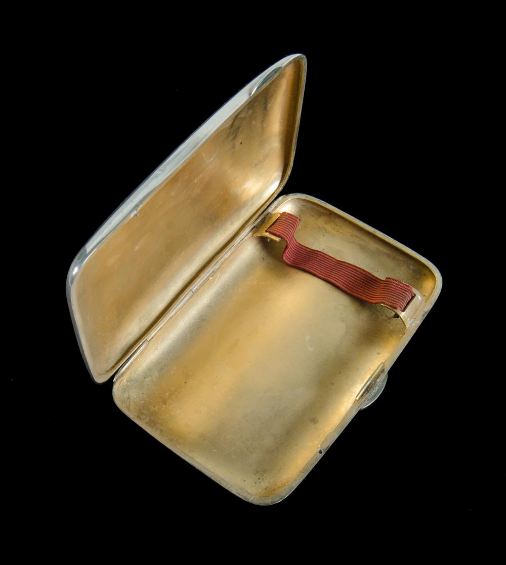 Vict. HMSS Cigar Case. Birmingham 1898, maker W.H.L. Gilt interior, scrolling engraved decoration, central rondel with monogram. W193g Estimate $100-200