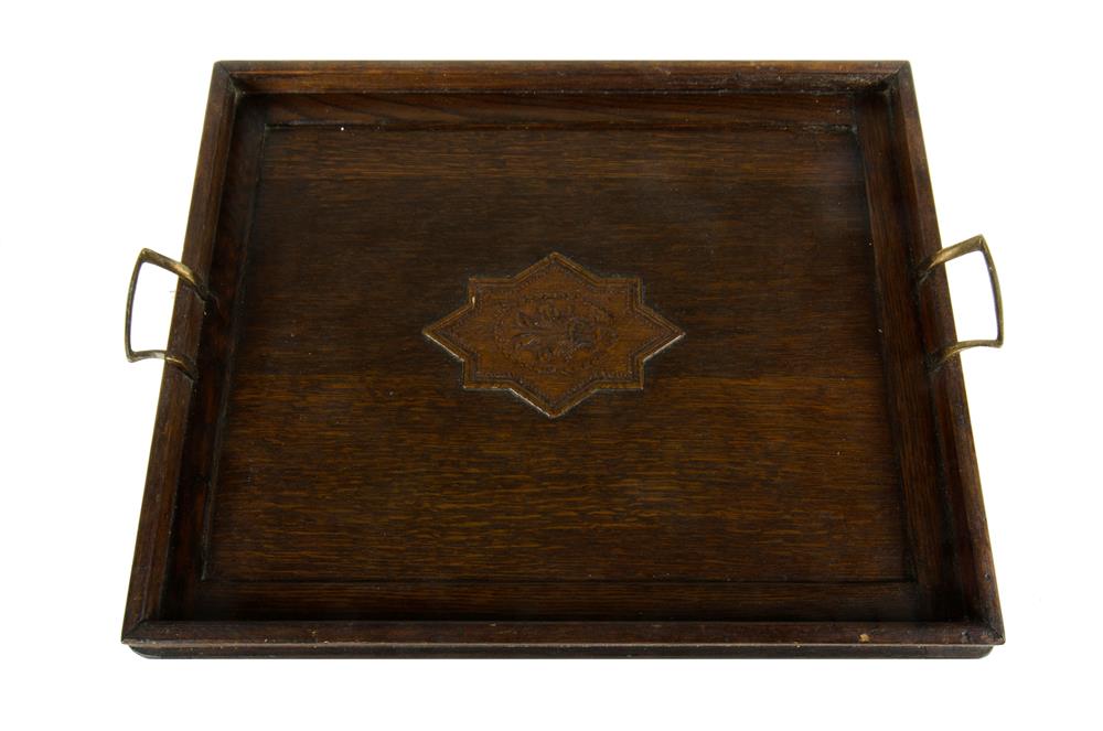 Edwardian Twin Handled Oak Tray. With central low relief star carving. Fold down legs. L57cmx45cm Estimate $30-50
