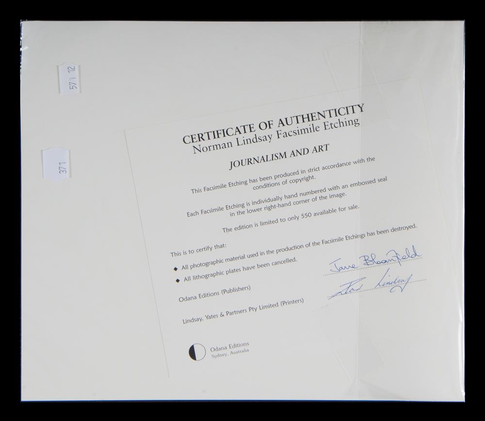 LINDSAY, Norman (1879-1969) 'Journalism and Art' Certificate of authenticity from Odana Editions. Facsimile Etching 140/550 15x14cm Estimate $100-200