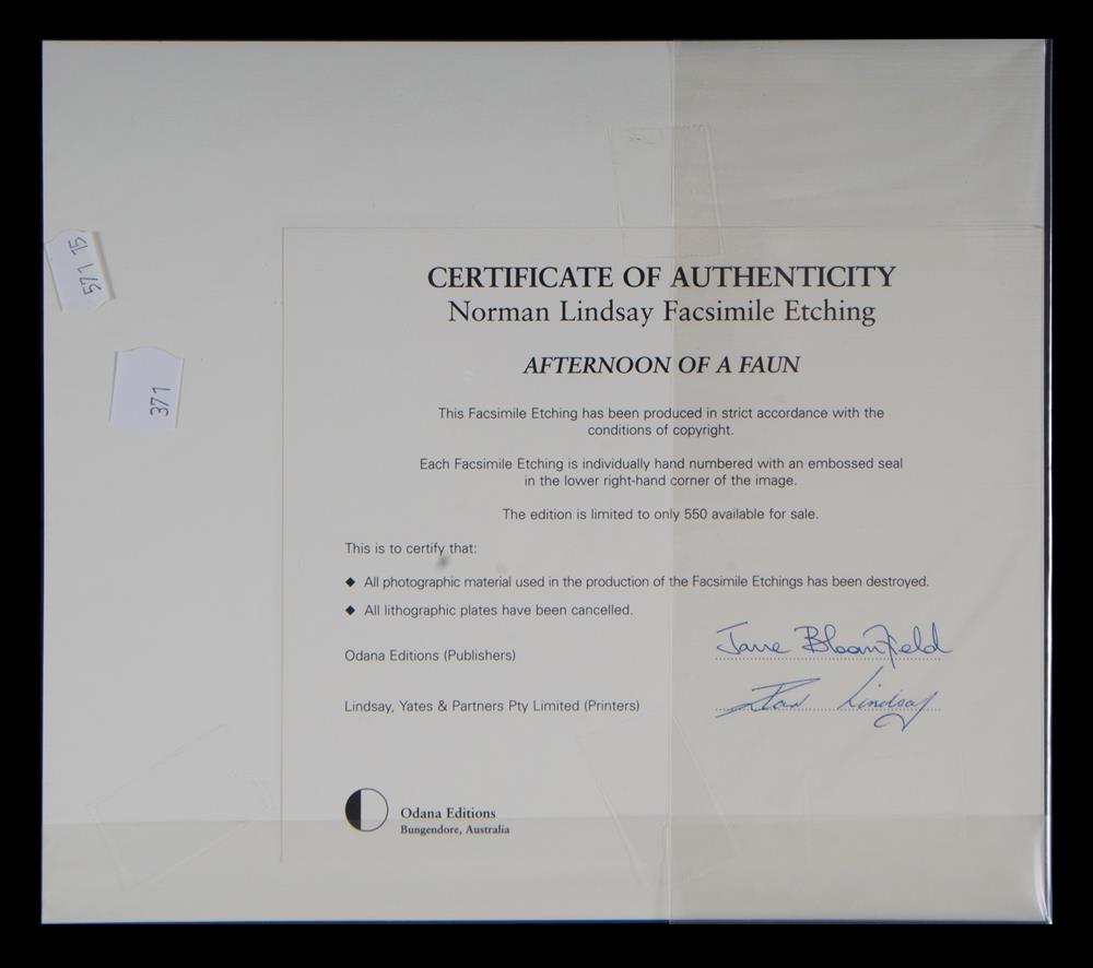 LINDSAY, Norman (1879-1969) 'Afternoon of a Faun' Certificate of authenticity from Odana Editions. Facsimile Etching 200/550 10x8cm Estimate $100-200