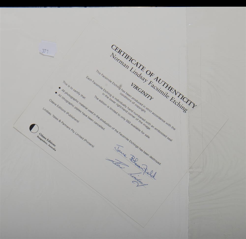 LINDSAY, Norman (1879-1969) 'Virginity' Certificate of authenticity from Odana Editions. Facsimile Etching 357/550 39x29cm Estimate $150-250