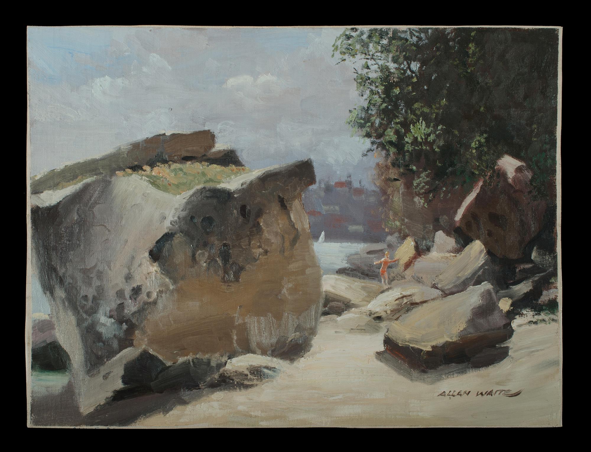 WAITE, Allan (1924-2010) (2) 'Shadowed Sandstone, Forty Baskets' (30x40cm); & 'Castle Rock [Middle Harbour, Sydney]' (30.5x41cm). Oil on Canvas on Board (2)Estimate $100-200