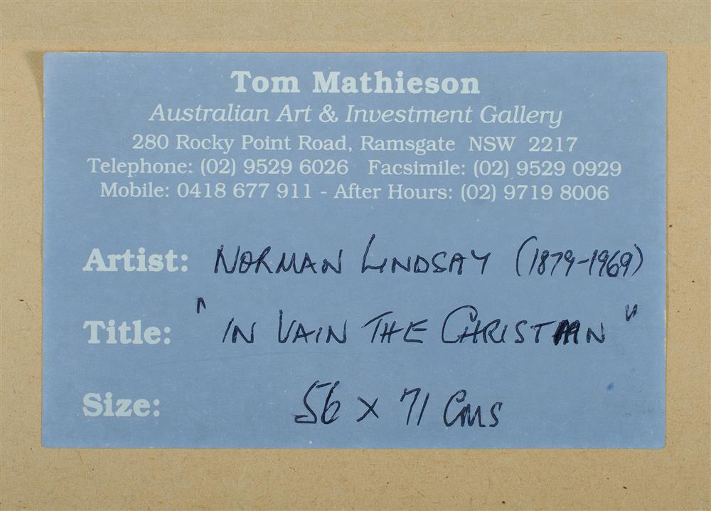 LINDSAY, Norman (1879-1969) 'In Vain the Christian,' 1923 (dated in plate). Published by Chiswick Press, London. Hand signed in pencil by Norman Lindsay. Ex Tom Mathieson Gallery (label verso). Collotype 53x70cm Estimate $1,000-1,600
