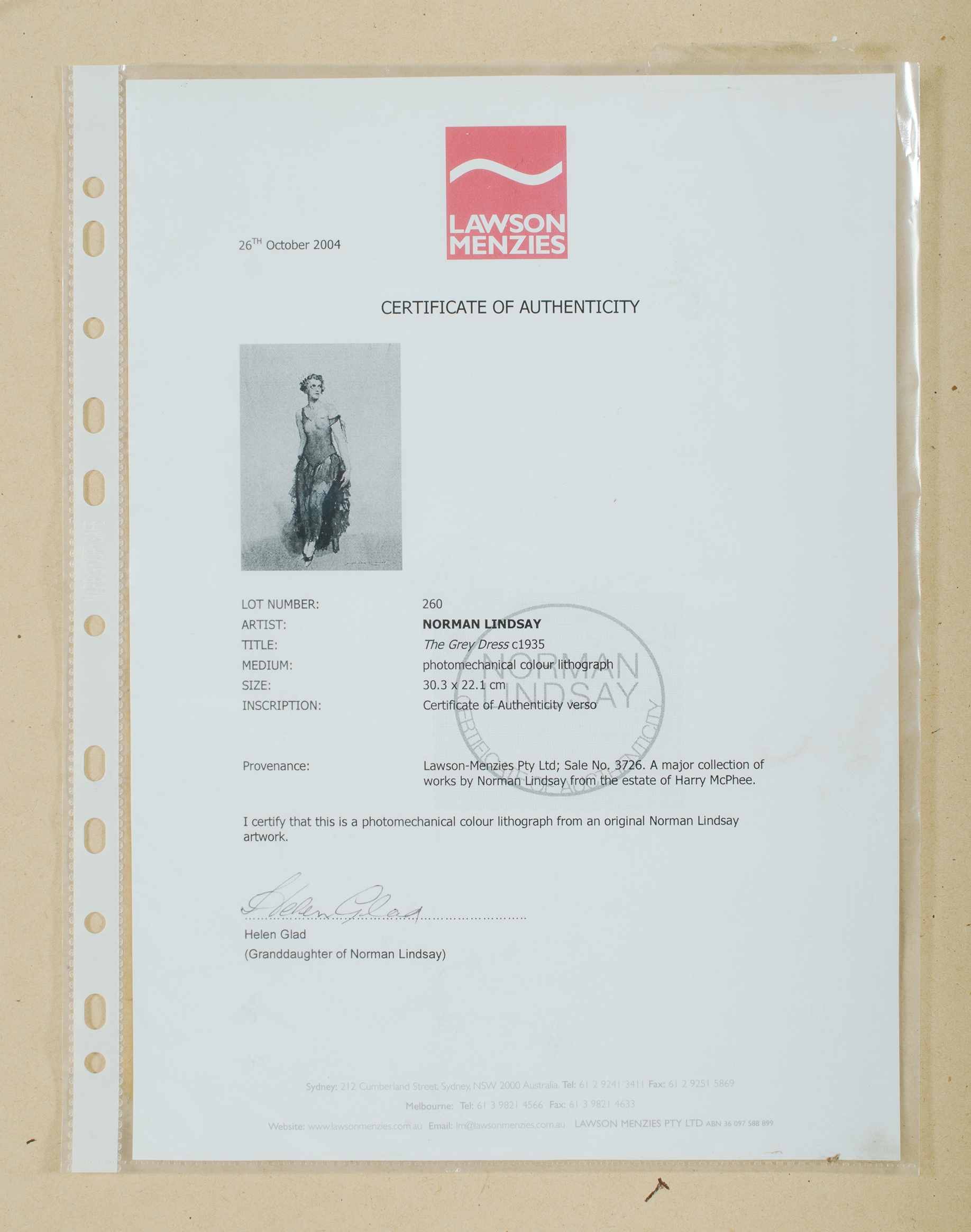 LINDSAY, Norman (1879-1969) 'Doreen' Also known as 'The Grey Dress.' Printed by William Hackett, c1935 (certificate verso signed Helen Glad) Lithograph 30x22cmEstimate $200-400