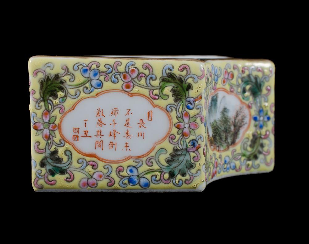 Fine Chinese Fine Porcelain Brushwasher. Fan form, with two small reserves painted with landscapes & two with inscriptions. Yellow ground with scrolling floral & leaf tendrils. Bears Yongzheng seal mark in red to base. (H4cm) Estimate $80-150