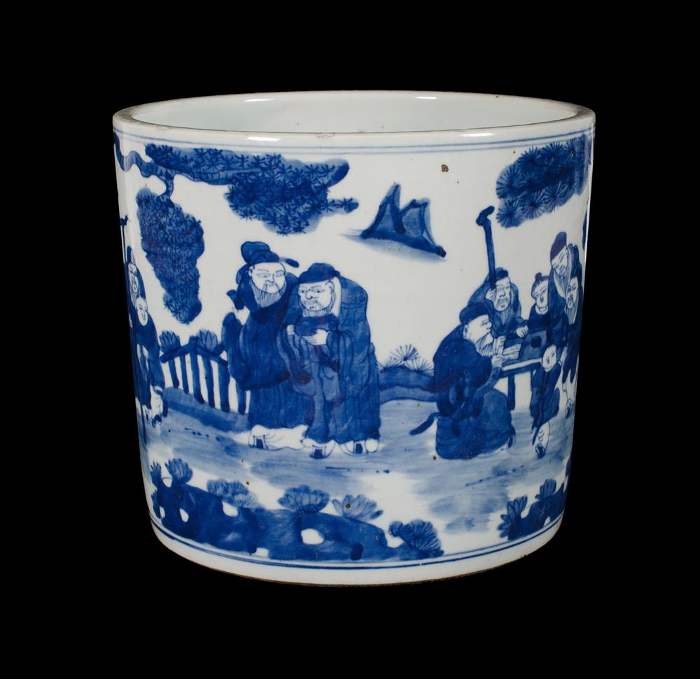 Chinese Blue & White Brush Pot. Underglaze blue decoration of groups of scholars in a garden with attendants. (H19cm Dia 21cm) Estimate $150-250