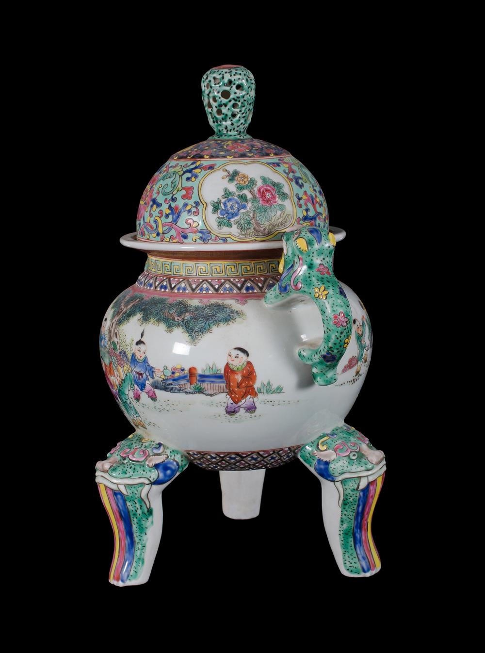 Chinese Porcelain Censer. Tri-footed, double-handled lidded censer with famille rose decoration of children playing in a garden. Bears underglaze blue Qialong mark to base. (H38cm) Estimate $200-400