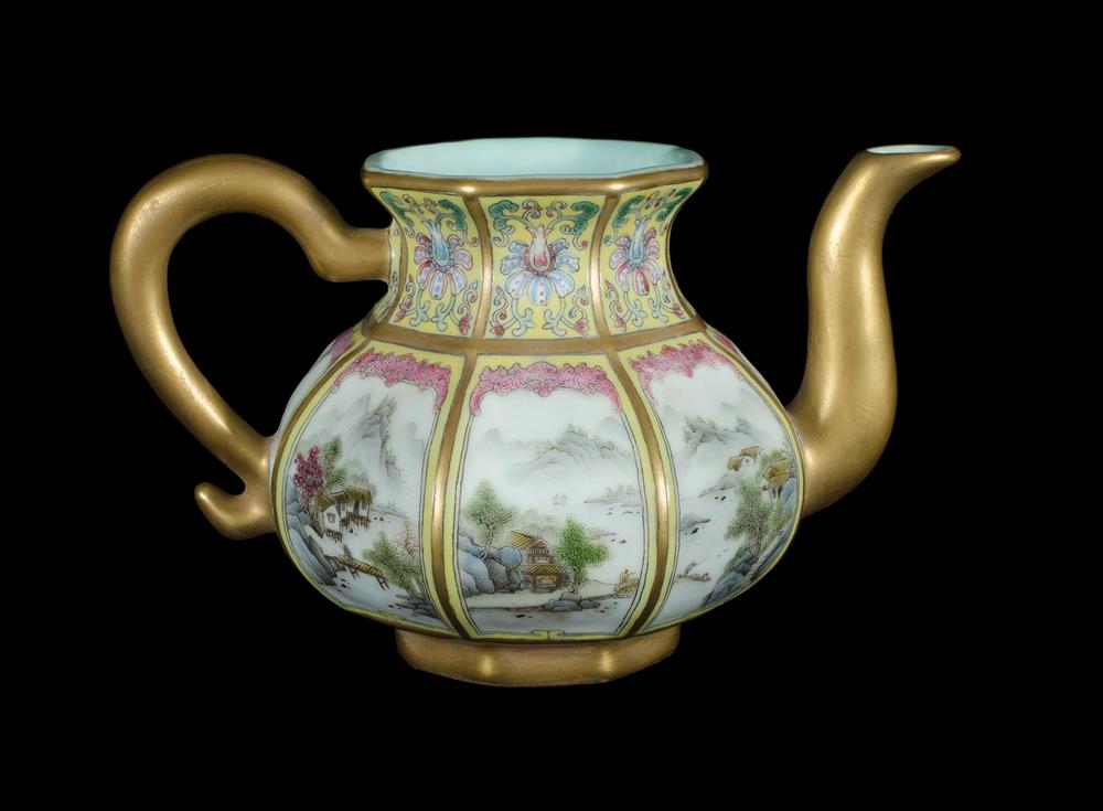 Chinese Famille Rose Porcelain Teapot. Eight panels, decorated with delicate landscapes, gilt spout & handle. Bears six character mark to base. (H10cm) Estimate $80-150