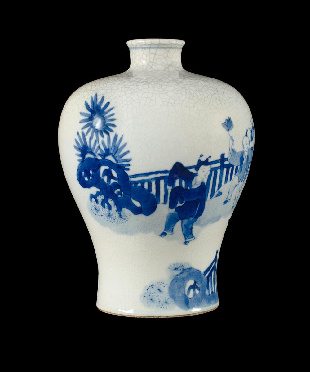 Chinese Soft Paste Meiping Form Vase. With underglazed blue decoration of a lady & two boys in a graden. Bears six character K'ang Hsi mark to base. (H13.5cm) Estimate $300-500