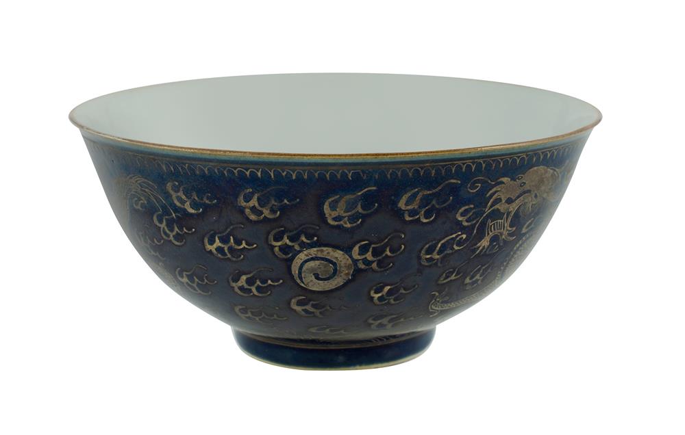 Chinese Porcelain Bowl. Cobalt ground with 2 silver dragons above waves, chasing flaming pearl. Underglaze blue period mark to base. (H8cm Dia 17cm) Estimate $300-600