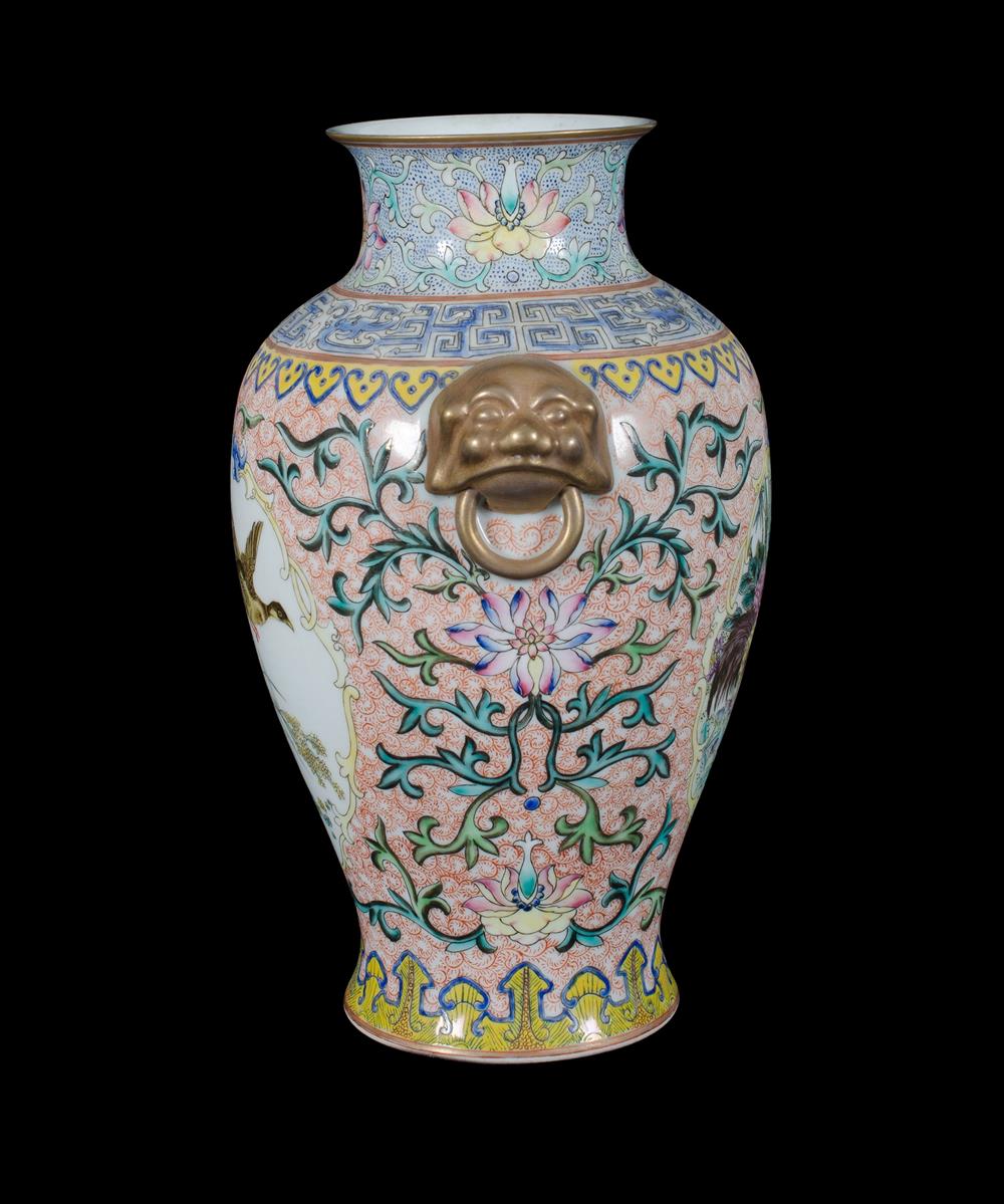 Chinese Porcelain Baluster Vase. With twin lion mask ring handles. Overglazed polychrome decoration. Twin panels decorated with flowers & birds. Bears four character Qianlong mark to base. (H22cm) Estimate $300-600