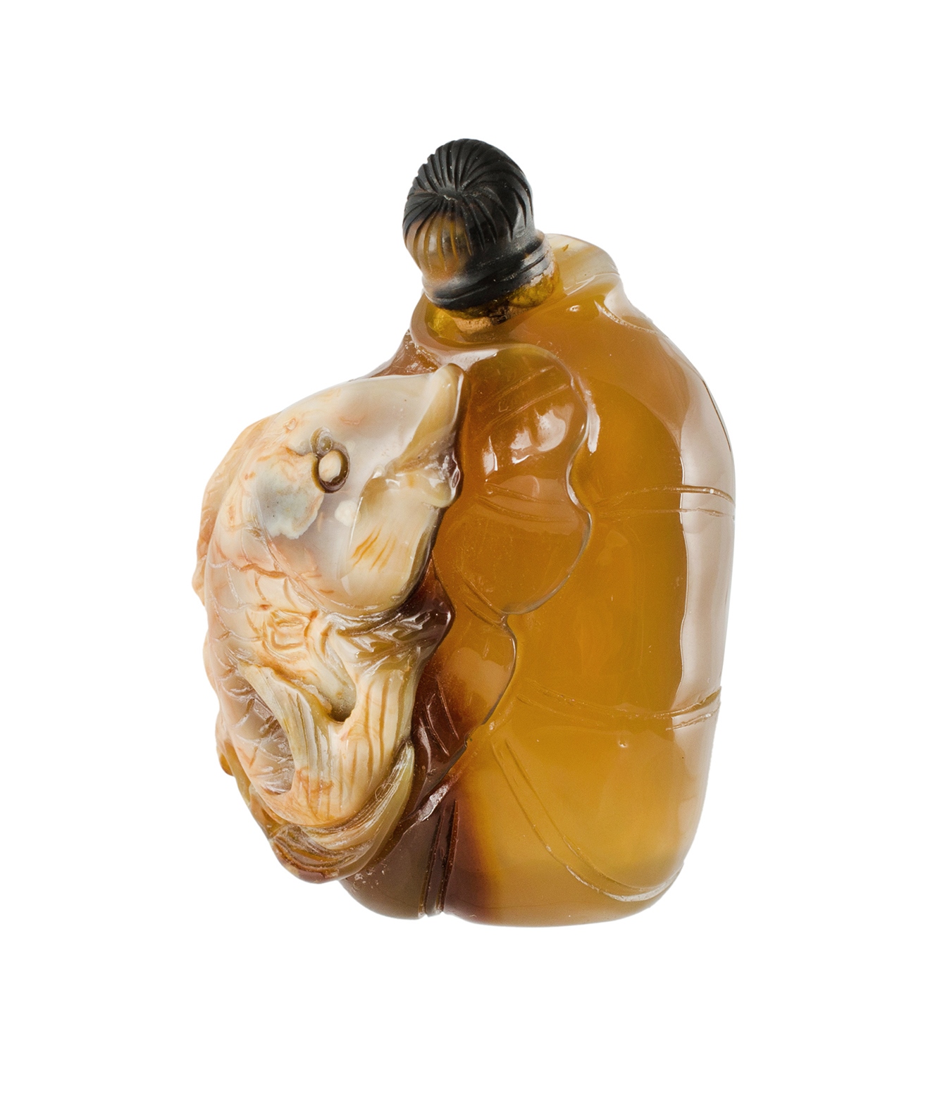 2 19th C Chinese Agate Snuff Bottles. One carved with high relief fish & lotus leaf. The other with flowers & leaves. One stopper missing. H5.5cm (each)Estimate $50-100