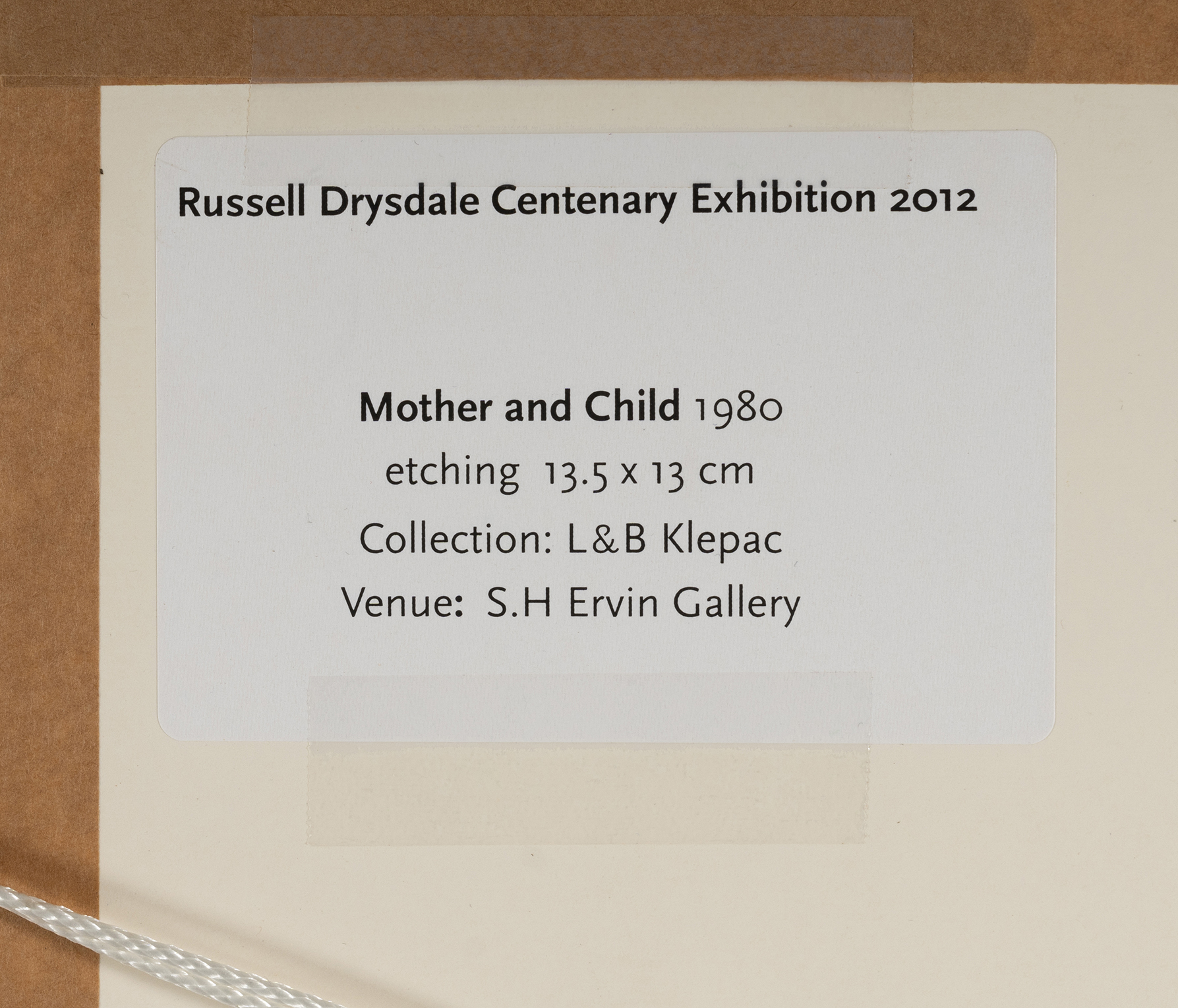 DRYSDALE, Russell (1912-1981) 'Mother and Child,' 1980. Studio stamp signature. Etching 19/50 13.5x13cm EXHIBITIONS: 'Russell Drysdale Centenary Exhibition 2012,' S.H. Ervin Gallery, Sydney (label verso).Estimate $400-700