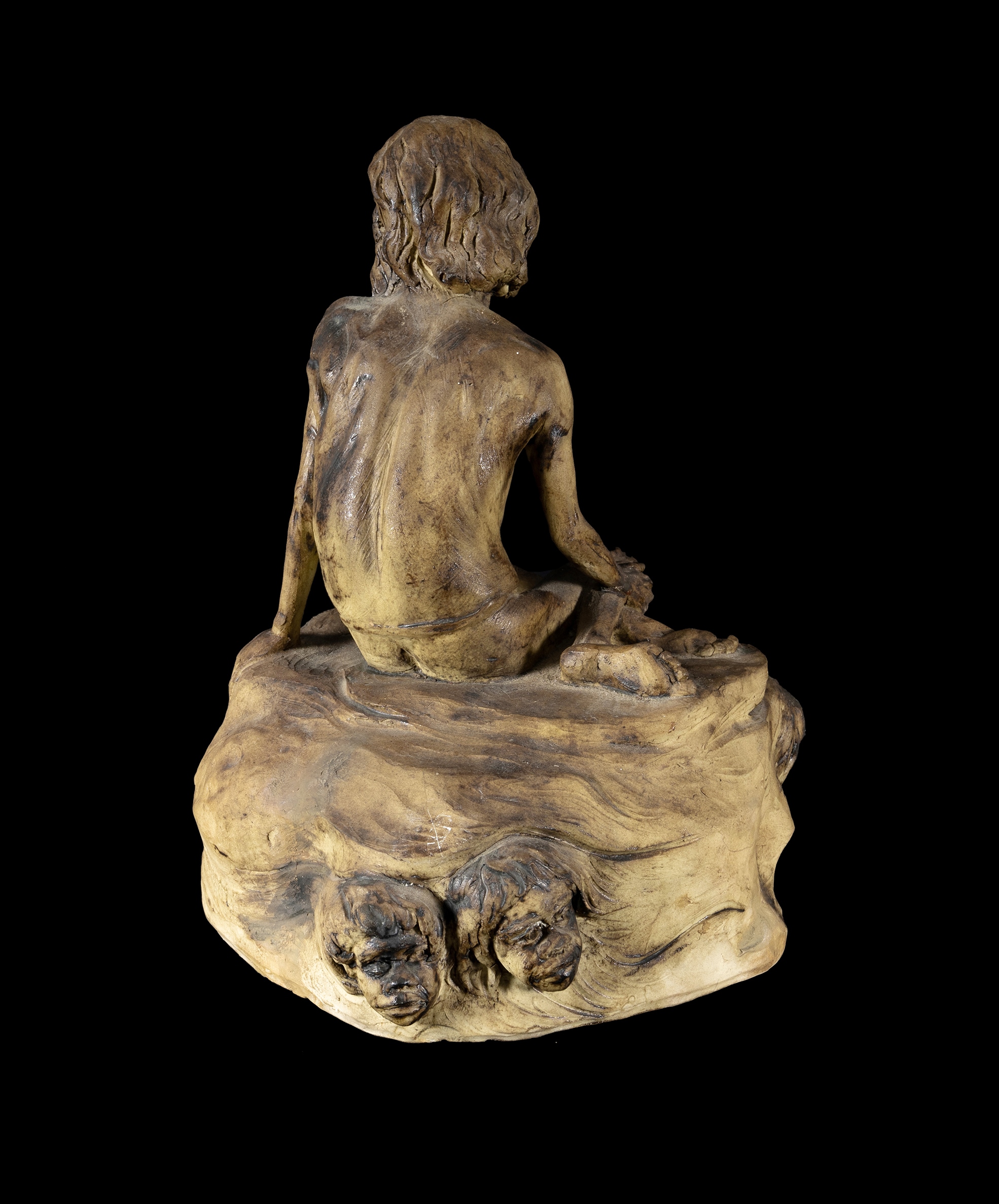 RICKETTS, William (1899-1993) Aboriginal Elder - modelled seated on a rock. Incised signature verso. Restorations (possibly to original firing cracks). Clay Sculpture H29.5cm PROVENANCE: Private collection, Sydney.Estimate $300-500