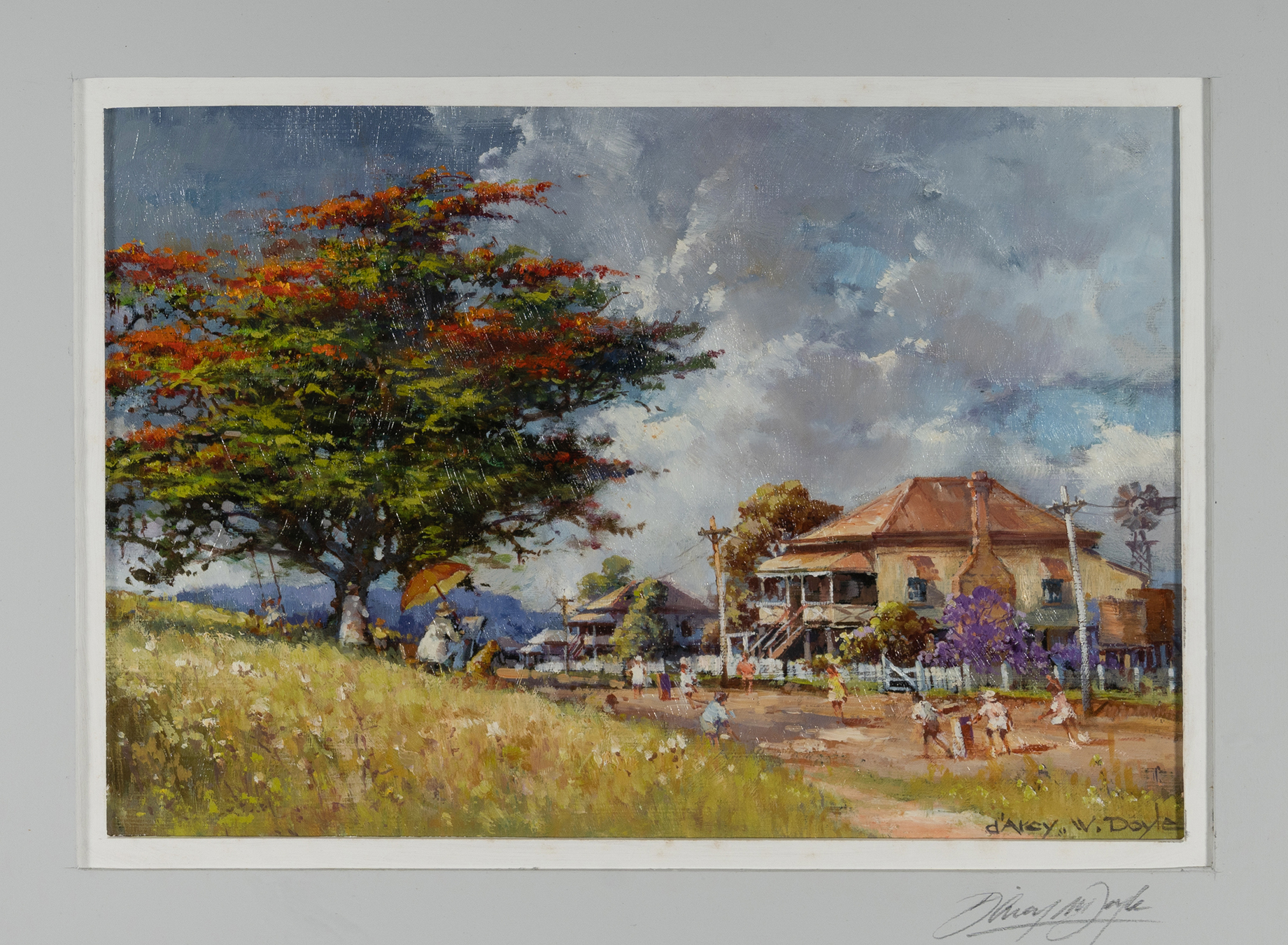 DOYLE, d'Arcy (1932-2001) Town Scene with Cricketers Oil on Board 21x30.5cm PROVENANCE: Gift from the artist in the late 1980s; thence by descent.Estimate $2,000-4,000