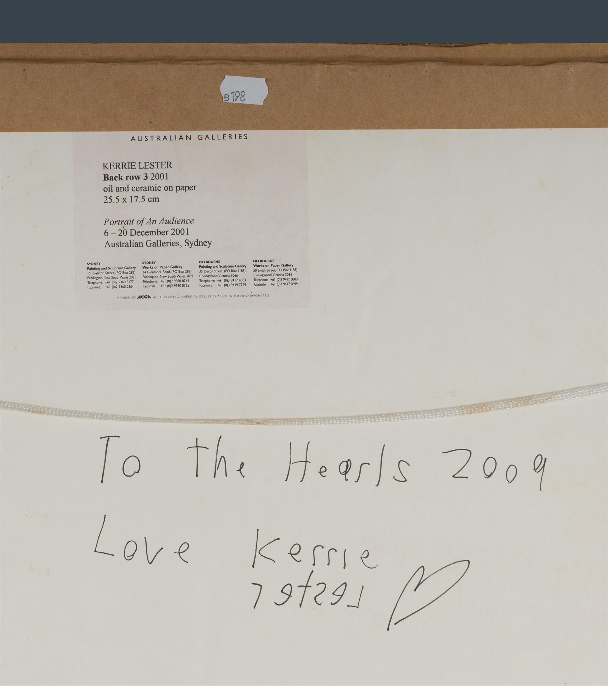 LESTER, Kerrie (1953-2016) 'Back row 3,' 2001. Oil & Ceramic on Paper 25.5x17.5cm EXHIBITIONS: Australian Galleries 'Portrait of an Audience,' December 6-20, 2001 (label verso).Estimate $200-400