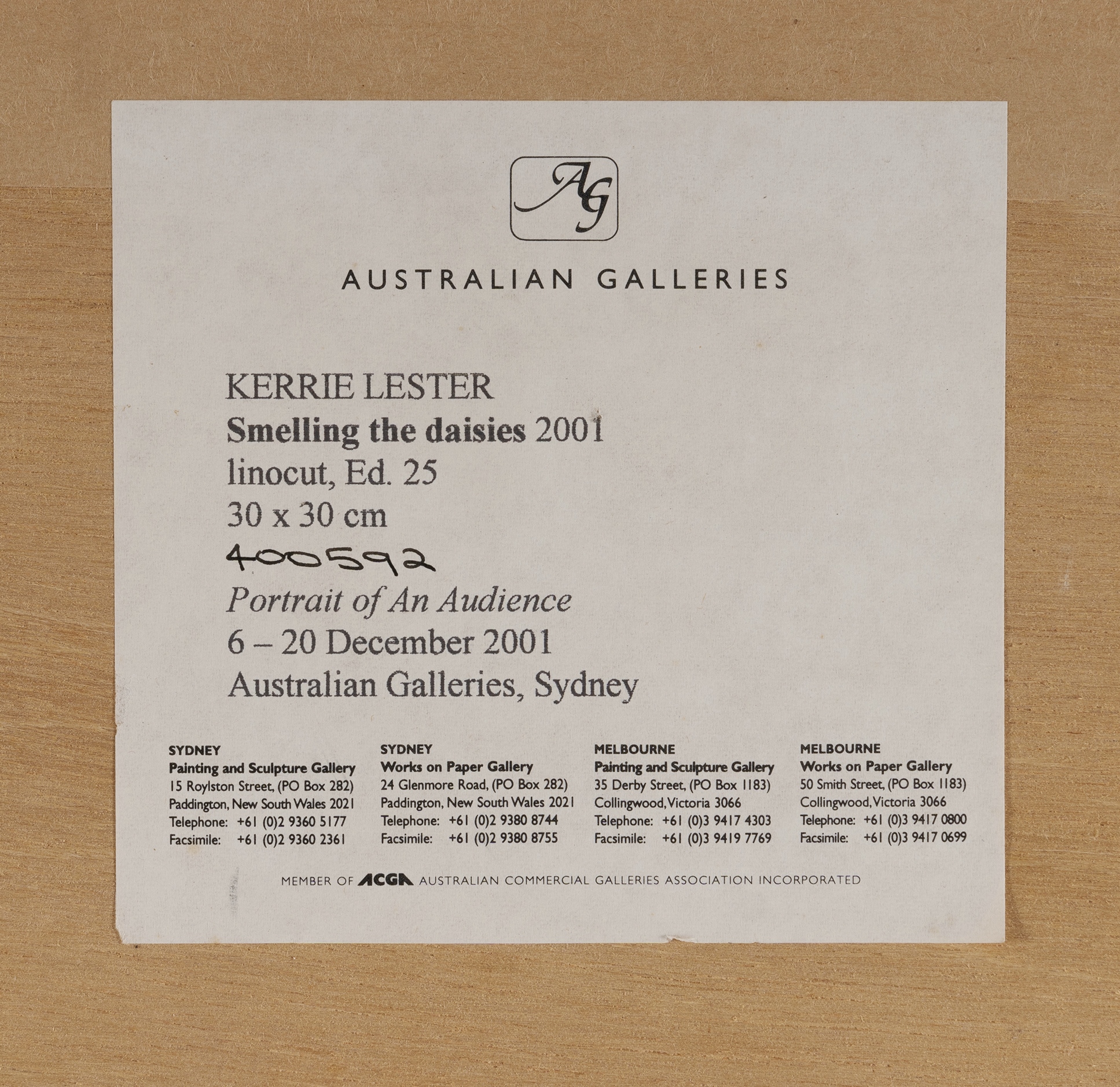 LESTER, Kerrie (1953-2016) 'Smelling the Daisies,' 2001. Linocut A/P (ed.25) 30x30cm (image) EXHIBITIONS: Australian Galleries 'Portrait of an Audience,' December 6-20, 2001 (label verso).Estimate $100-200