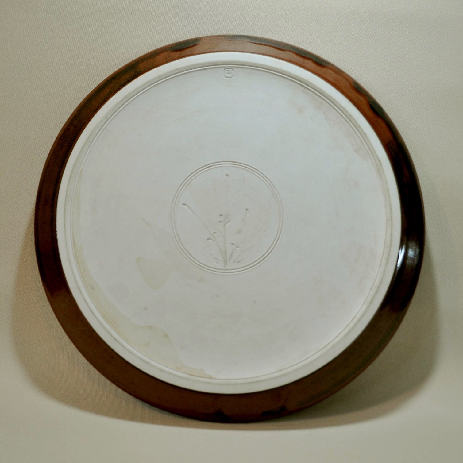 HARFORD, Chris, Large Buff Stoneware Charger. Tenmoku glaze with central disc, & chevron pattern of multi coloured glazes. Incised plant form to base, potter's seal 'CH' to base. (Dia 36.5cm)Estimate $150-250