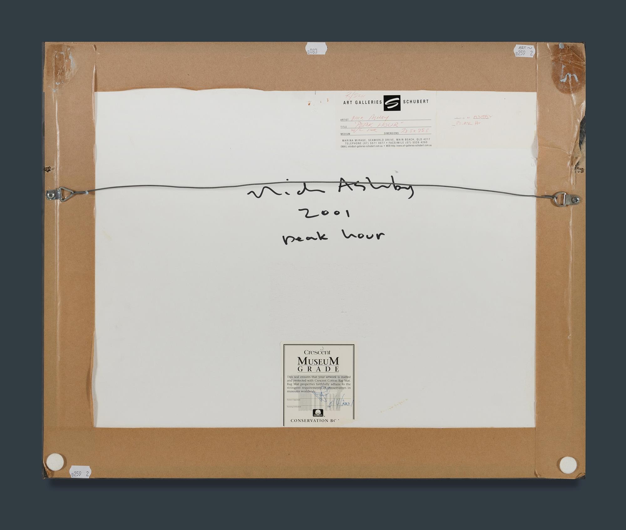ASHBY, Nick 'Peak Hour,' 2001. Signed verso, with additional inscriptions & label from Art Galleries Schubert, Main Beach, QLD. Ink & W/Clr 29x36cm (irregular)Estimate $150-250