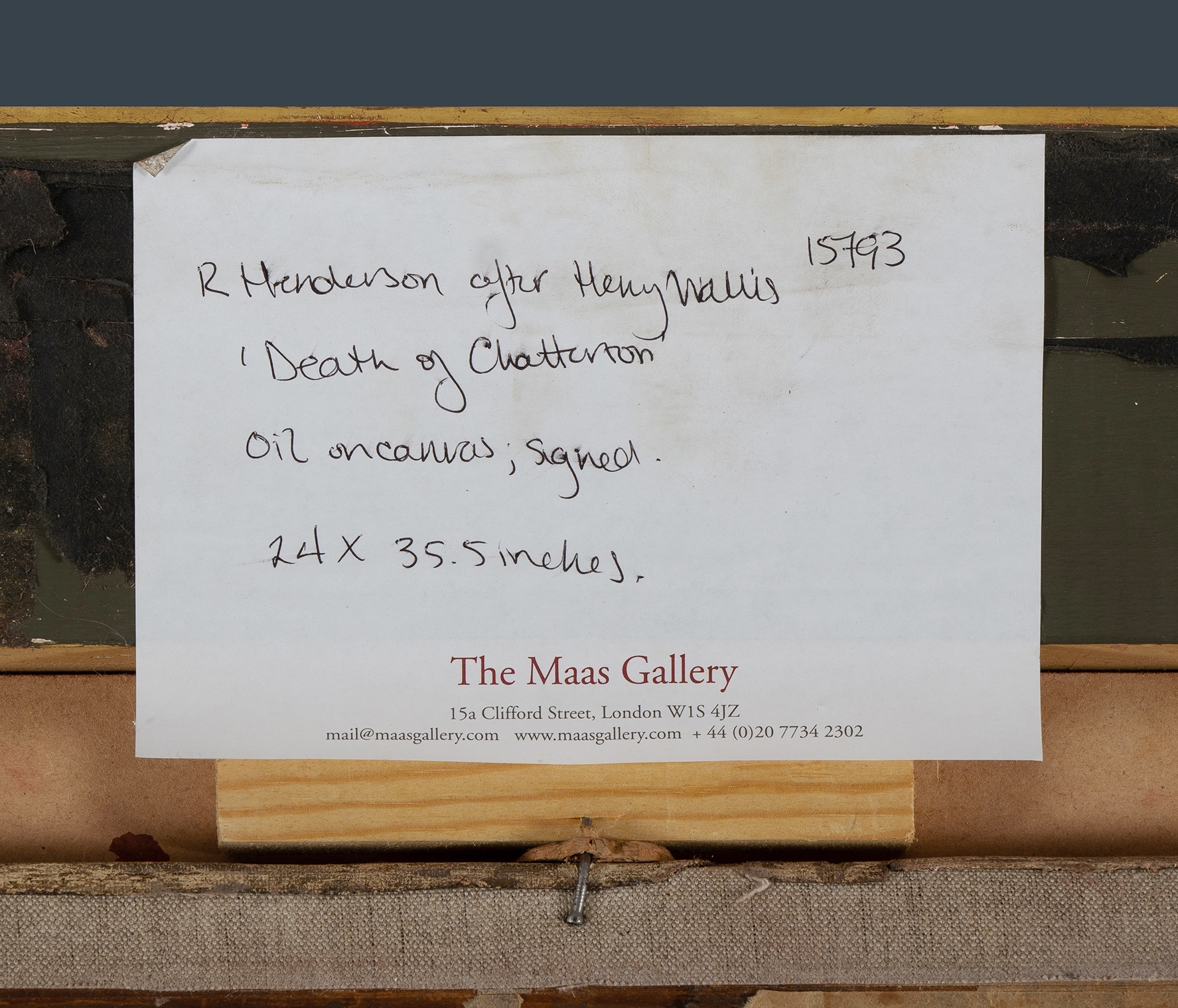 HENDERSON, R (British School) 'The Death of Chatterton,' after Henry Wallis. Oil on Canvas 59.5x90cm PROVENANCE: Maas Gallery, London (label verso). Estate Late John Schaeffer.Estimate $700-1,200