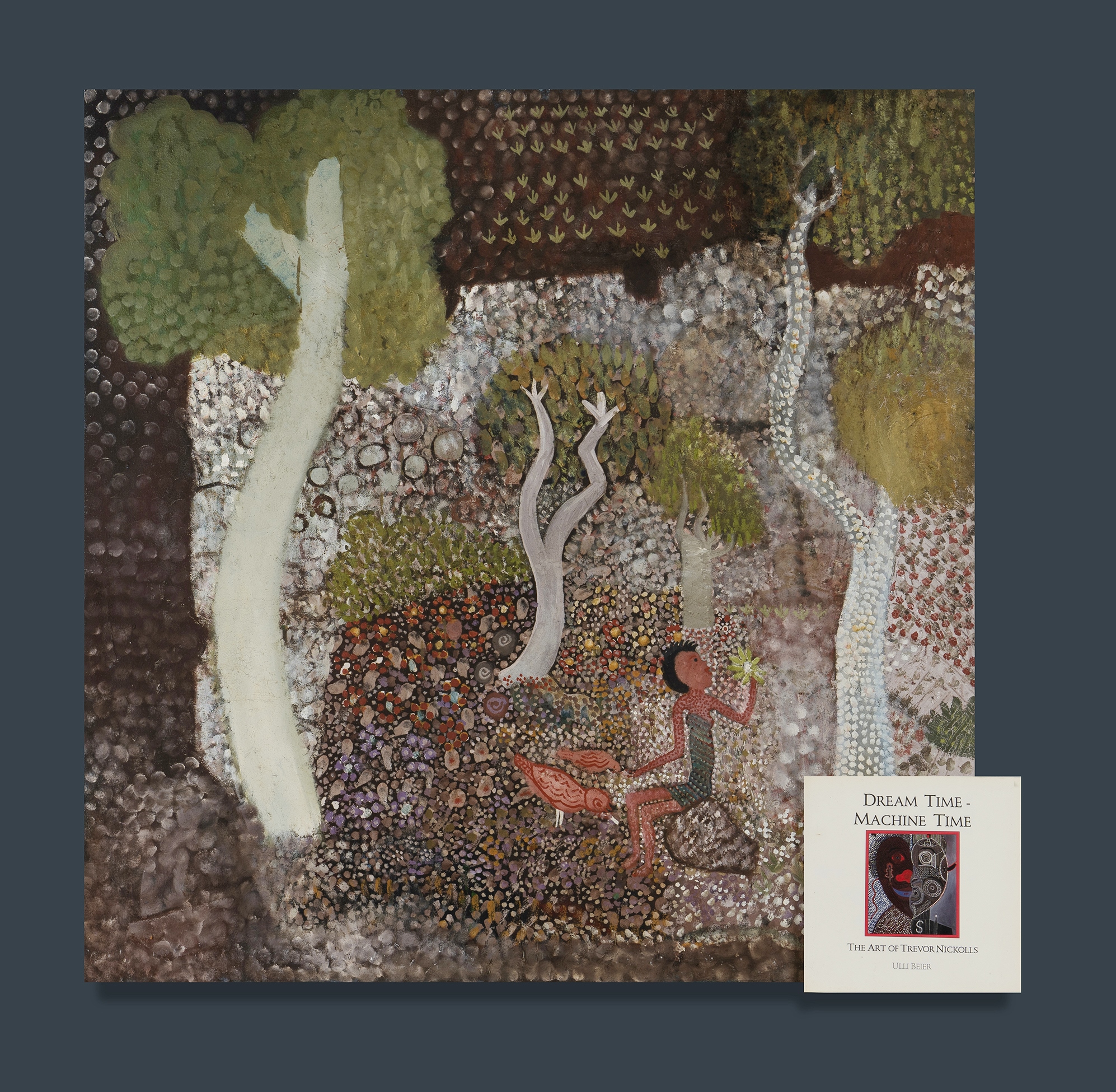 NICKOLLS, Trevor (Aboriginal 1949-2012) 'Manly Point,' Sydney 1984. Unsigned, but illus. 'Dream Time - Machine Time, The Art of Trevor Nickolls,' Ulli Beier, 1985, plate 18 (book included): ''in 1984 Trevor Nickolls lived in a studio overlooking Manly Point. The beautiful view was marred to him by the suburban villas and affluent yachts; symbols of the European invasion. Feeling thoroughly isolated in the wealthy, leisurely suburb of Manly, Trevor Nickolls tried to visualise the beauty of this landscape before the coming of the white man. The painting relies heavily on the Papunya 'dotting' technique.'' Acrylic & Mixed Media on Canvas 91x91cm