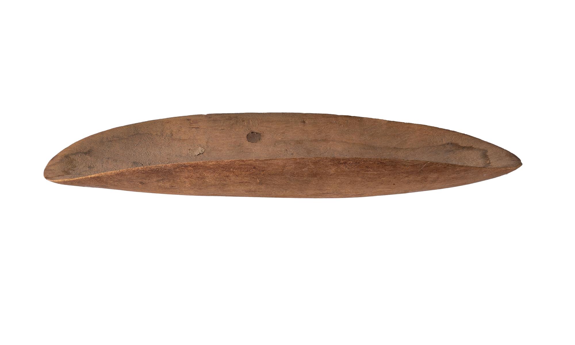 Various Aboriginal Items Coolamon (L75cm); & four various boomerangs, one with painted decoration (L80cm), collected at Balgo, circa 1980s, one pyrographed decorated.Estimate $100-200