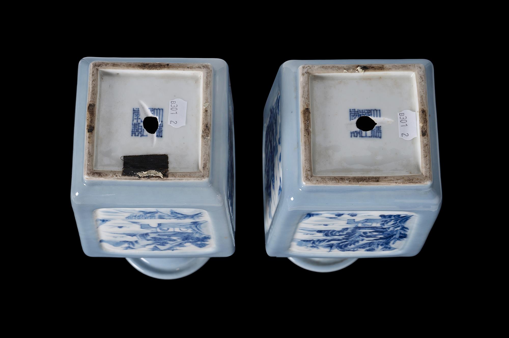 Pair Early 20th C Chinese Porcelain Vases. Of tapering square form, narrow waisted neck with everted rim. Each with blue & white panels of landscape decoration. On original wooden stands, each drilled to base for electrical fitting. H33cm (without stand)