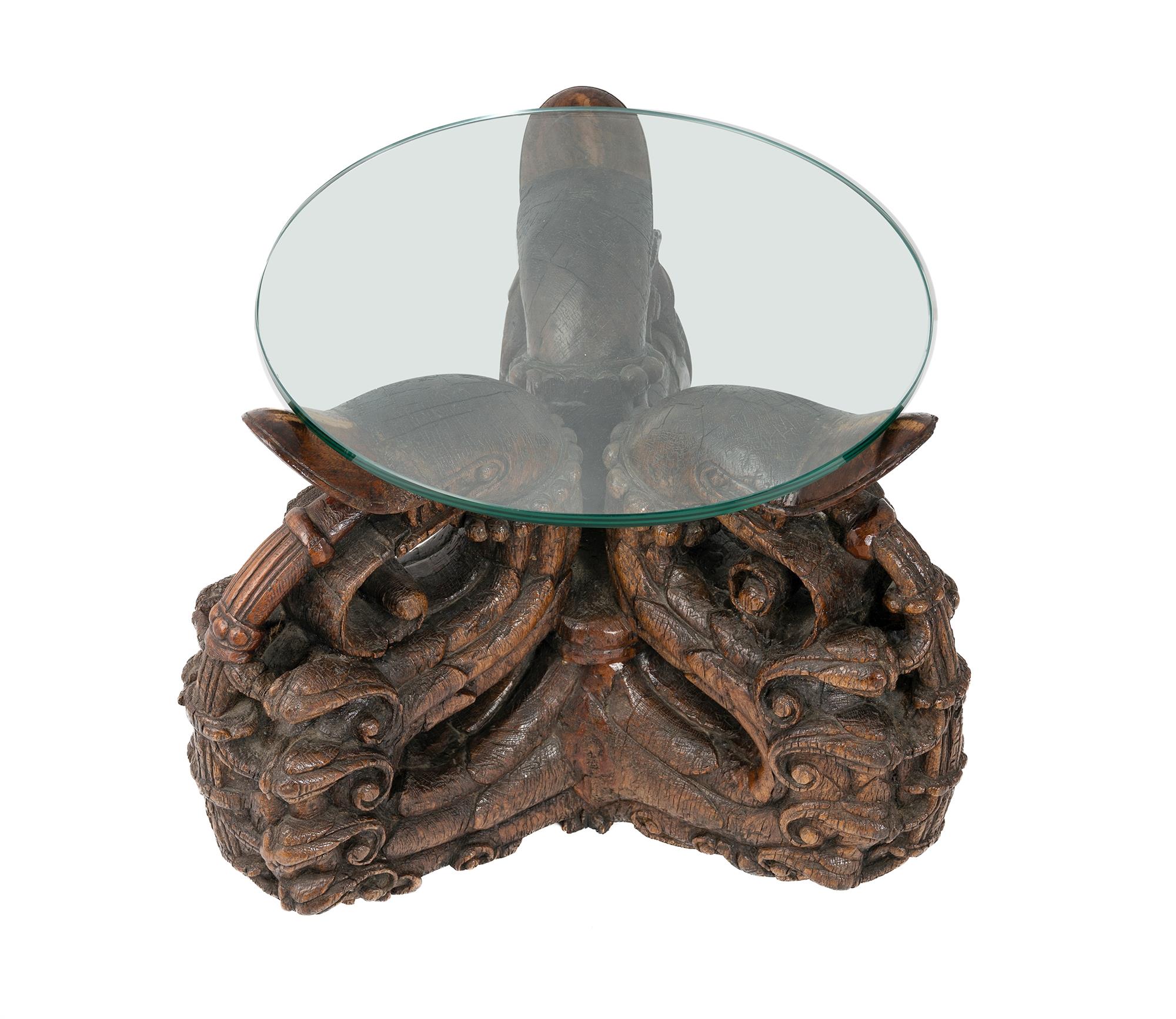 Unusual Indonesian Carved Coffee Table. Tri-form base carved with snarling mythological beasts. Circular glass top. (H46cm Dia 45cm)Estimate $100-300
