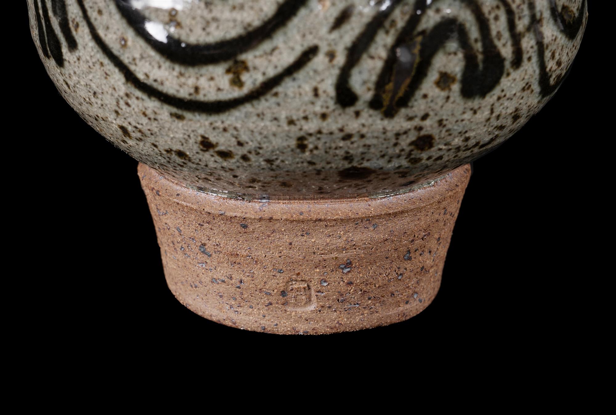 Stoneware Lidded Jar Ribbed body, celadon glaze, with a poured iron loop pattern to jar and lid. Potter's seal to foot ring (H16.5cm)Estimate $100-200