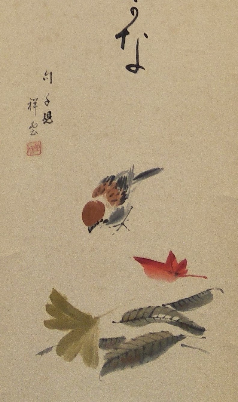 Chinese School, Small Bird and Fallen Leaves Inscription & artist's seal stamp. Ink & Colour on Paper 90x22cmEstimate $200-300