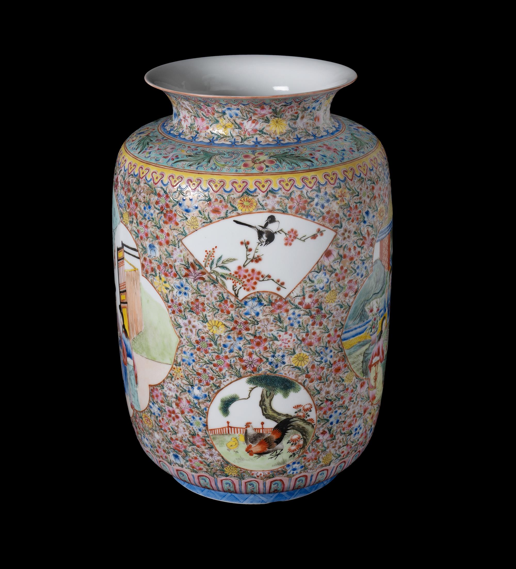 Chinese Porcelain Famille Rose Rouleau Vase. With reserve panels depicting ladies indoors & in a garden. 4 character reign mark to base, hairline crack. (H28cm)Estimate $200-400