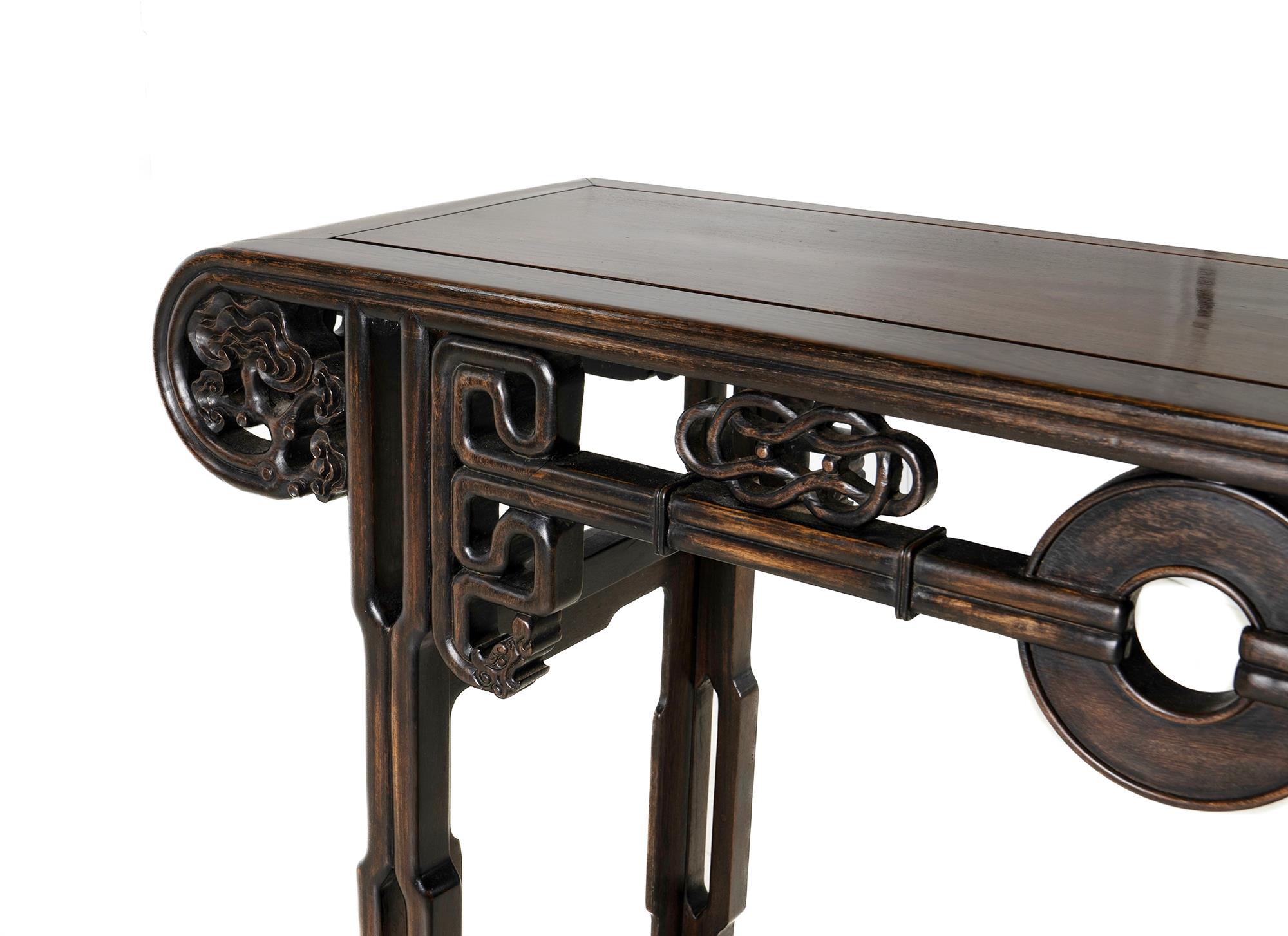 Chinese Rosewood Altar Table. Rectangular top with scroll ends & a pierced apron. Purchased Grafton Galleries, Double Bay. Ex collection of the Australian German Ambassador. H57.5cm L130cm D40cmEstimate $800-1,500