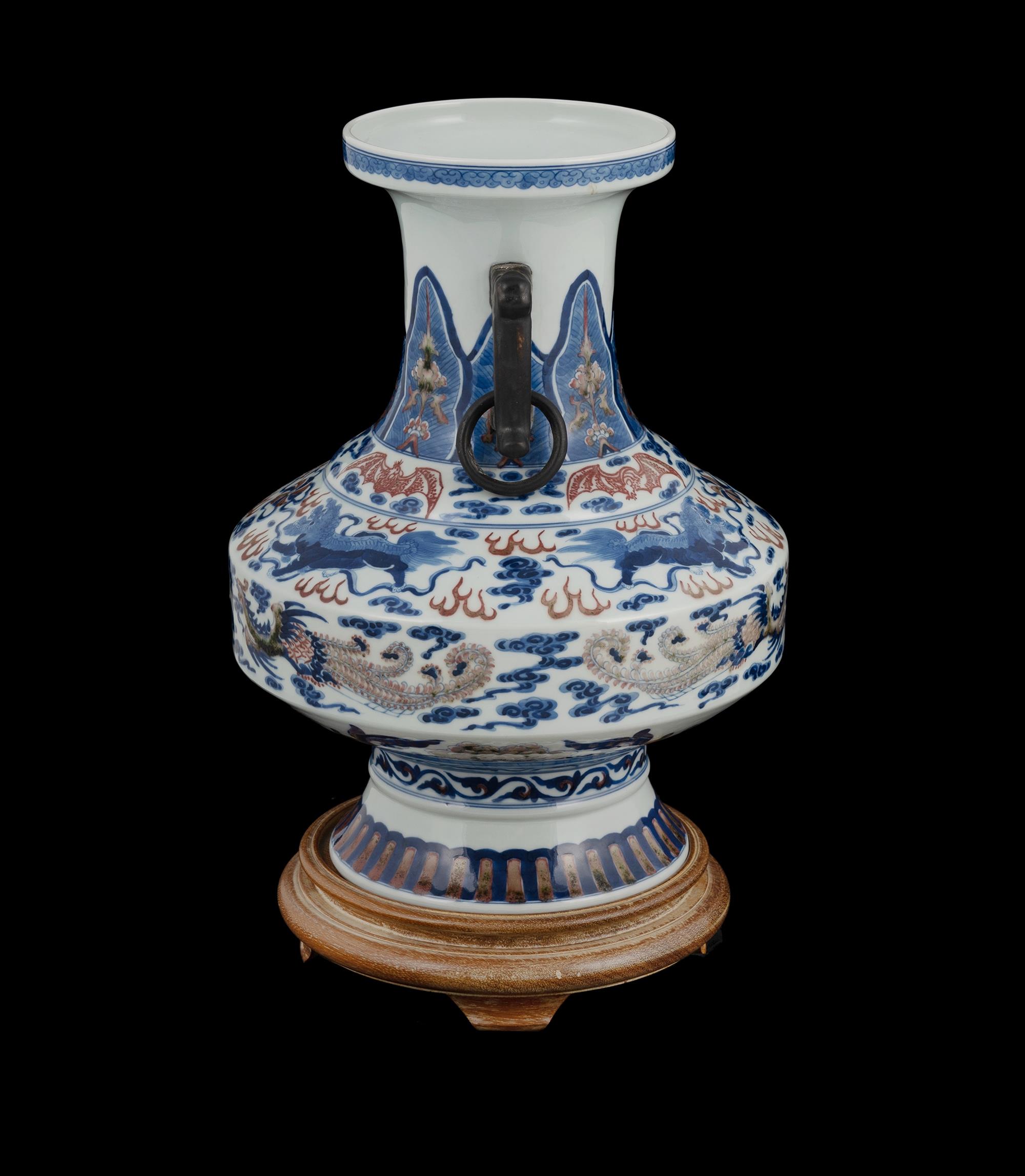 Chinese Blue & White Underglaze Red Vase. Twin handles with rings, decorated with bats, kirin & dragons. Qianlong mark to base. On wooden stand. (H36cm)Estimate $400-600