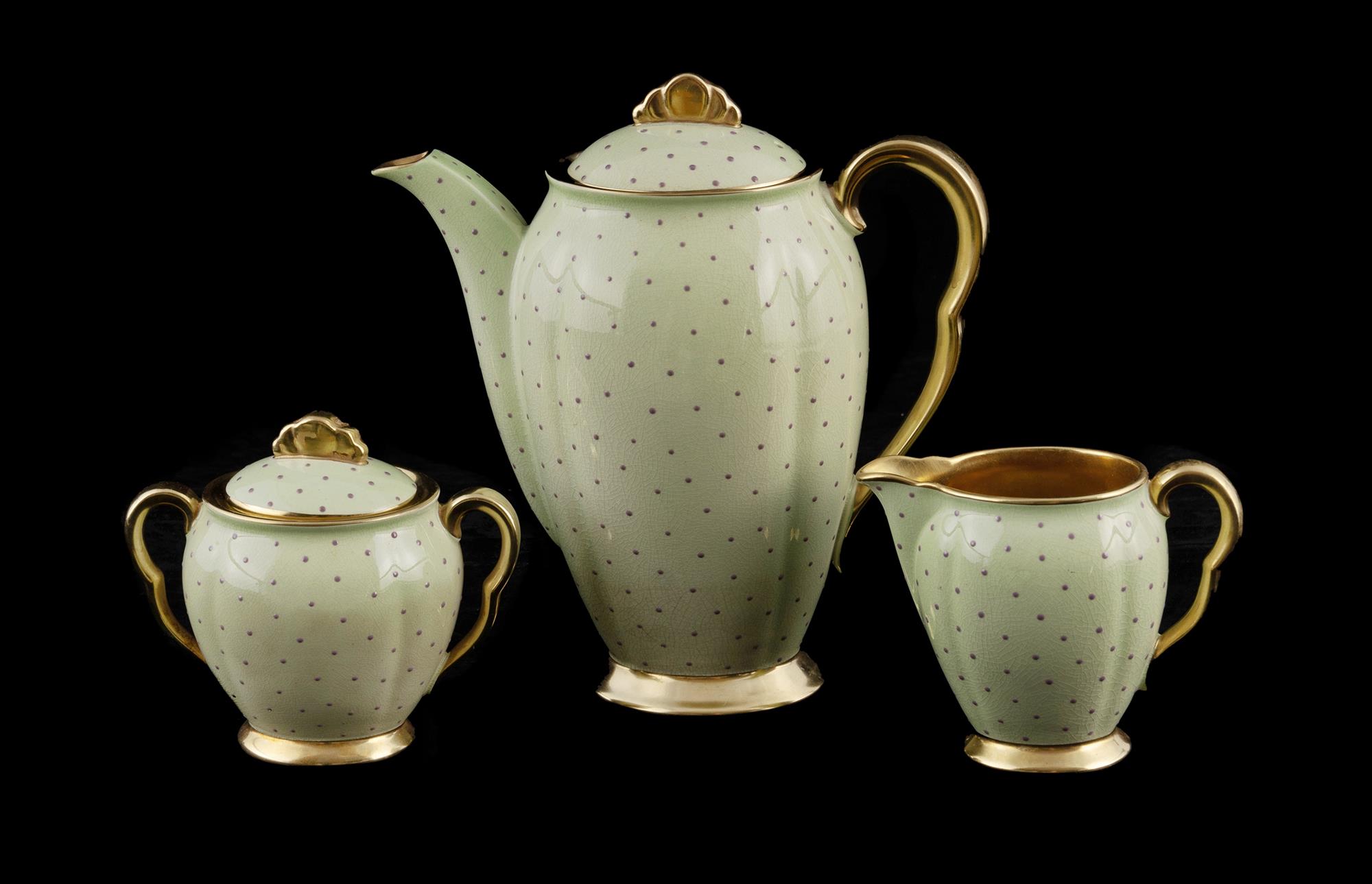 Carlton Ware Polka Dot Coffee Service Green with purple polka dots & gilt interior. Provenance: Deceased Estate, Sydney.Estimate $120-240