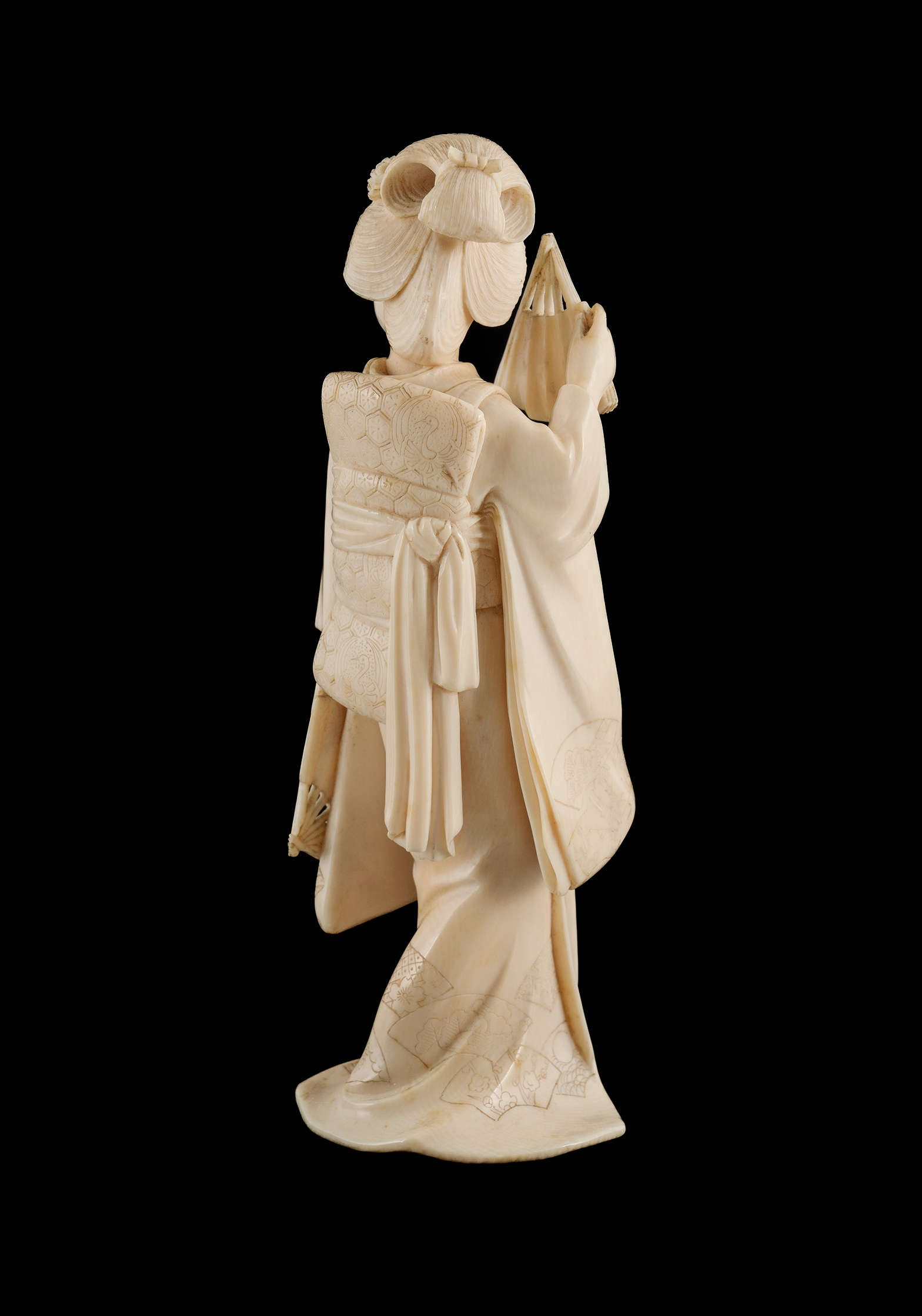 Japanese Late Meiji Period Ivory Okimono Depicting a very elegant geisha dancing with two fans. On a wooden stand. NB: ivory export restrictions. H17cm (without stand) Provenance: Deceased Estate, Sydney.Estimate $350-550