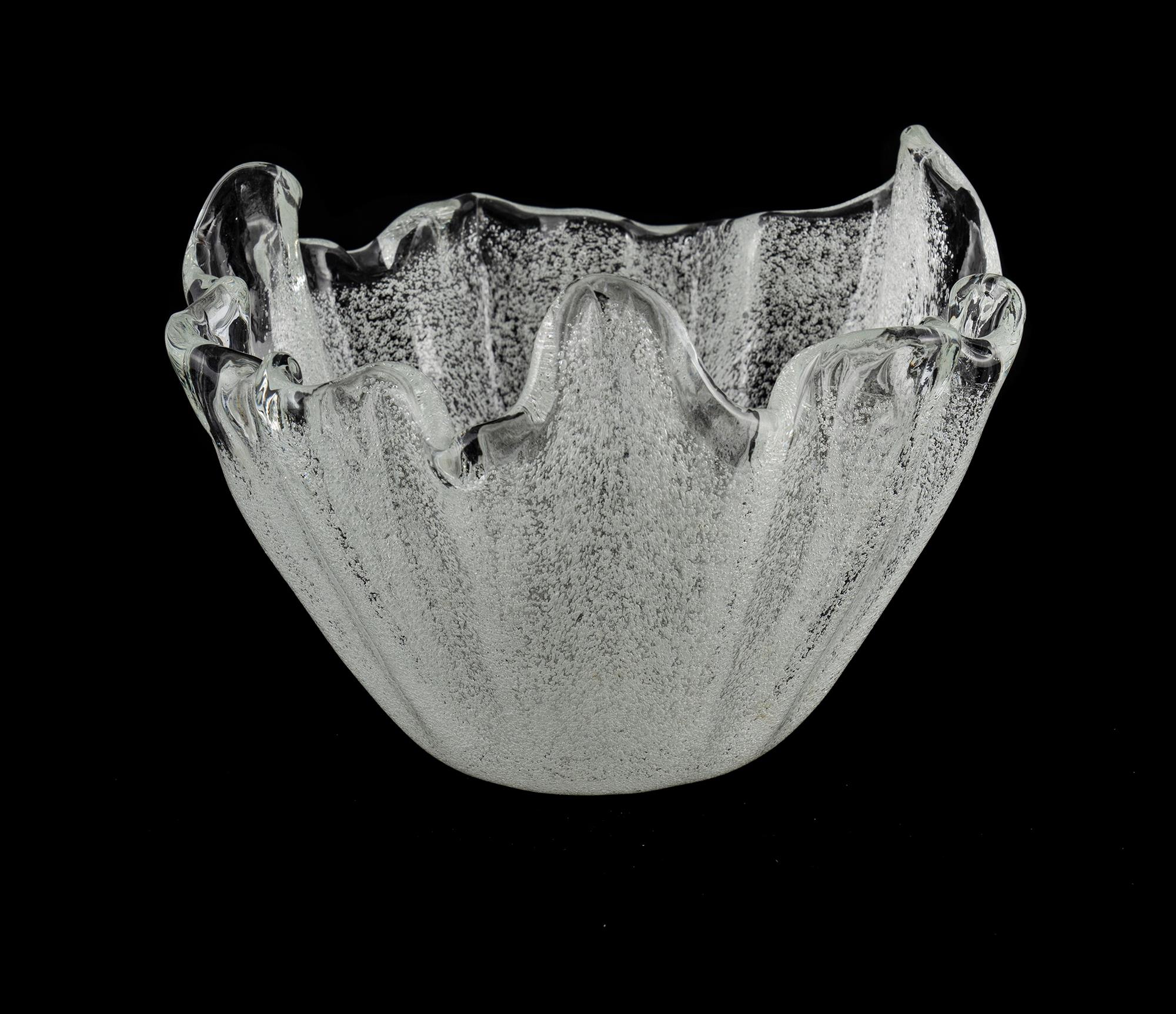 Two Murano Glass Items Large clear bubble glass handkerchief bowl; & a bird figure with aventurine. H16cm Dia 22cm (bowl) H14.5cm (bird figure) Provenance: Deceased Estate, Sydney.Estimate $100-150