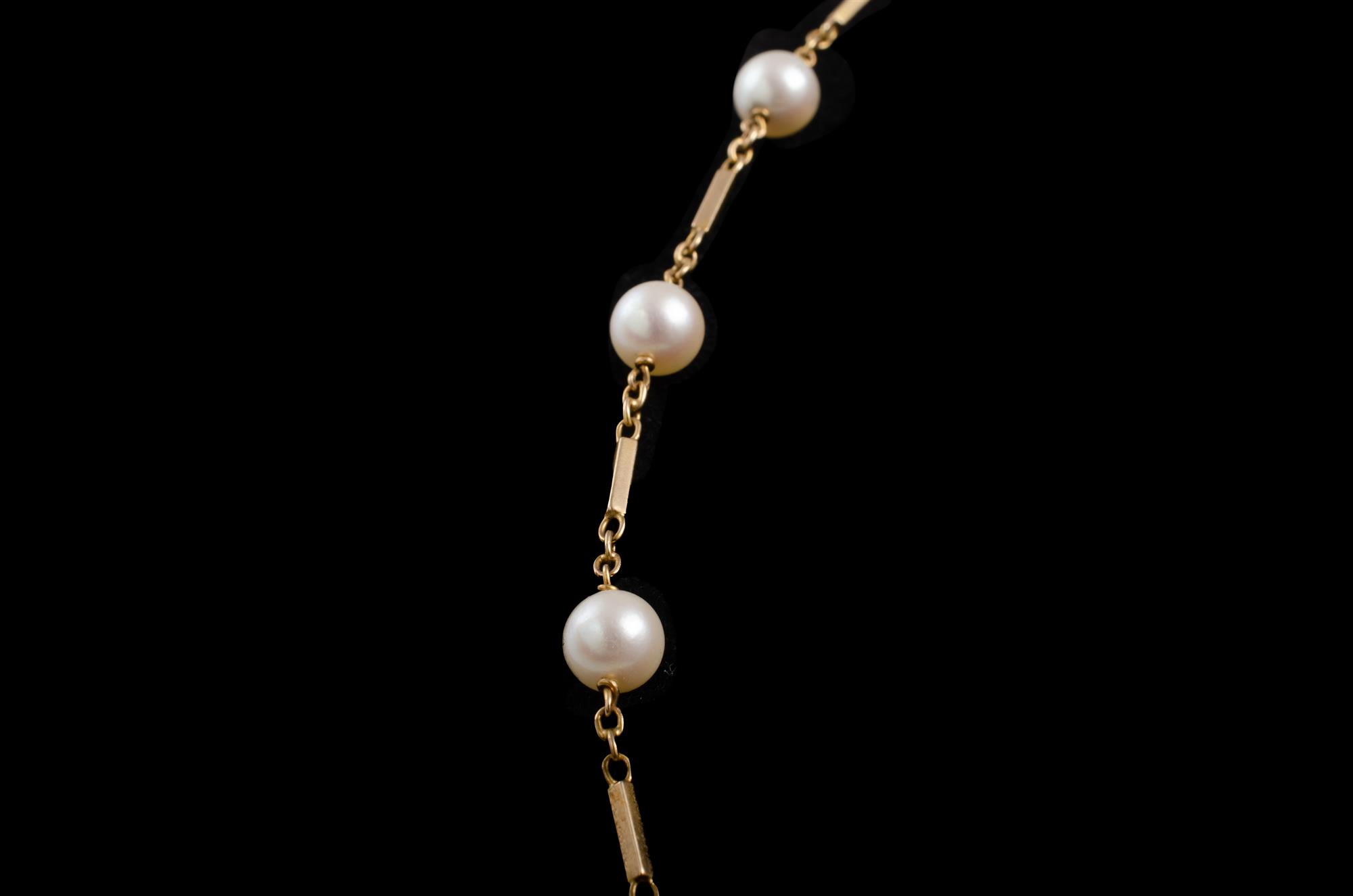 9ct Yellow Gold Pearl Necklace Sixteen 6 to 6.5mm cultured pearls on 9ct gold necklace. Total weight approx.10.2g (L44cm) Provenance: Deceased Estate, Sydney.Estimate $100-200