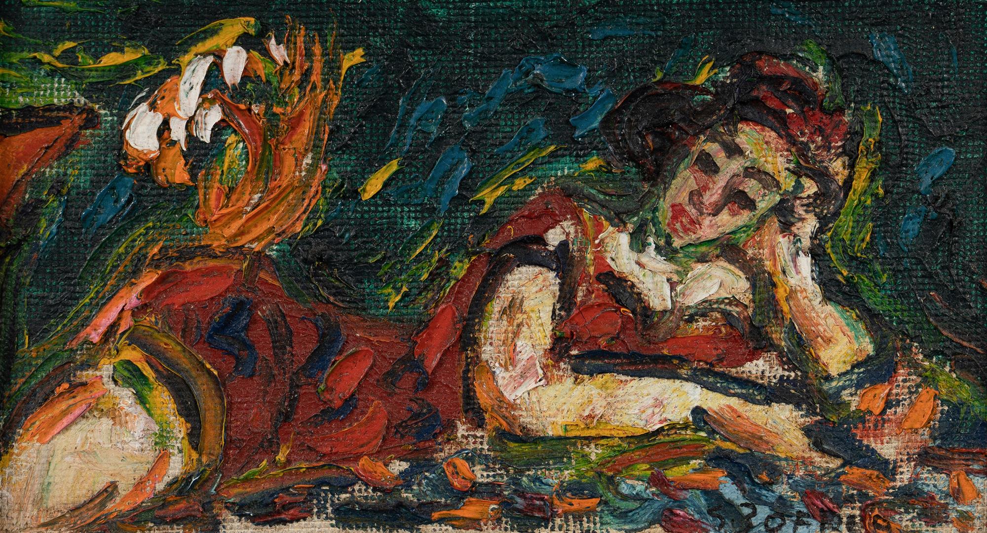 ZOFREA, Salvatore (b.1946) (2), Reclining Female in Red Dress (15x27.5cm); & 'Three Heads' (15.5x22.5cm) Oil on Board (2) Provenance: Estate Late Kay Warren.Estimate $300-500