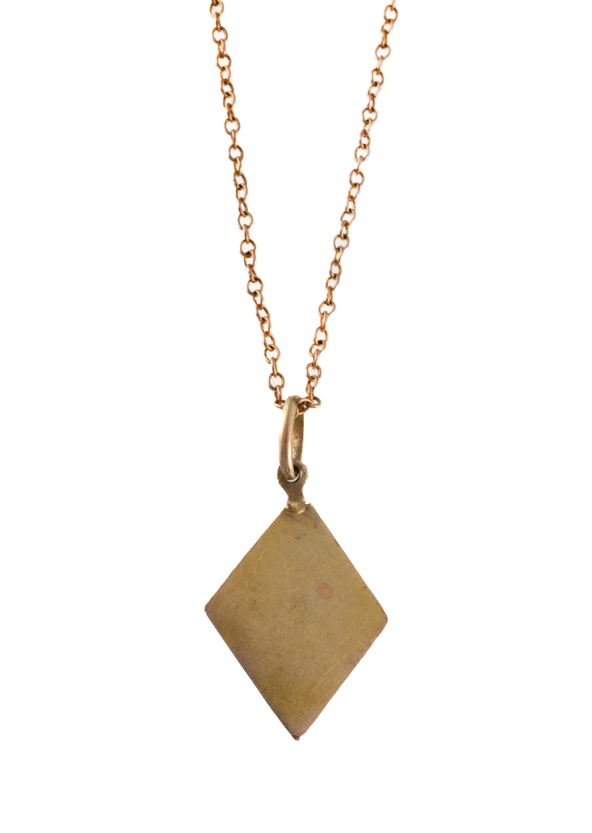9ct Pink Gold & 22ct Gilt 'Madonna' Pendant' on 9ct Pink Gold Chain Pink gold diamond shaped pendant with 22ct gilt finish. Chain length 41cm Total weight approx. 22g Provenance: Deceased Estate, Sydney.Estimate $50-90