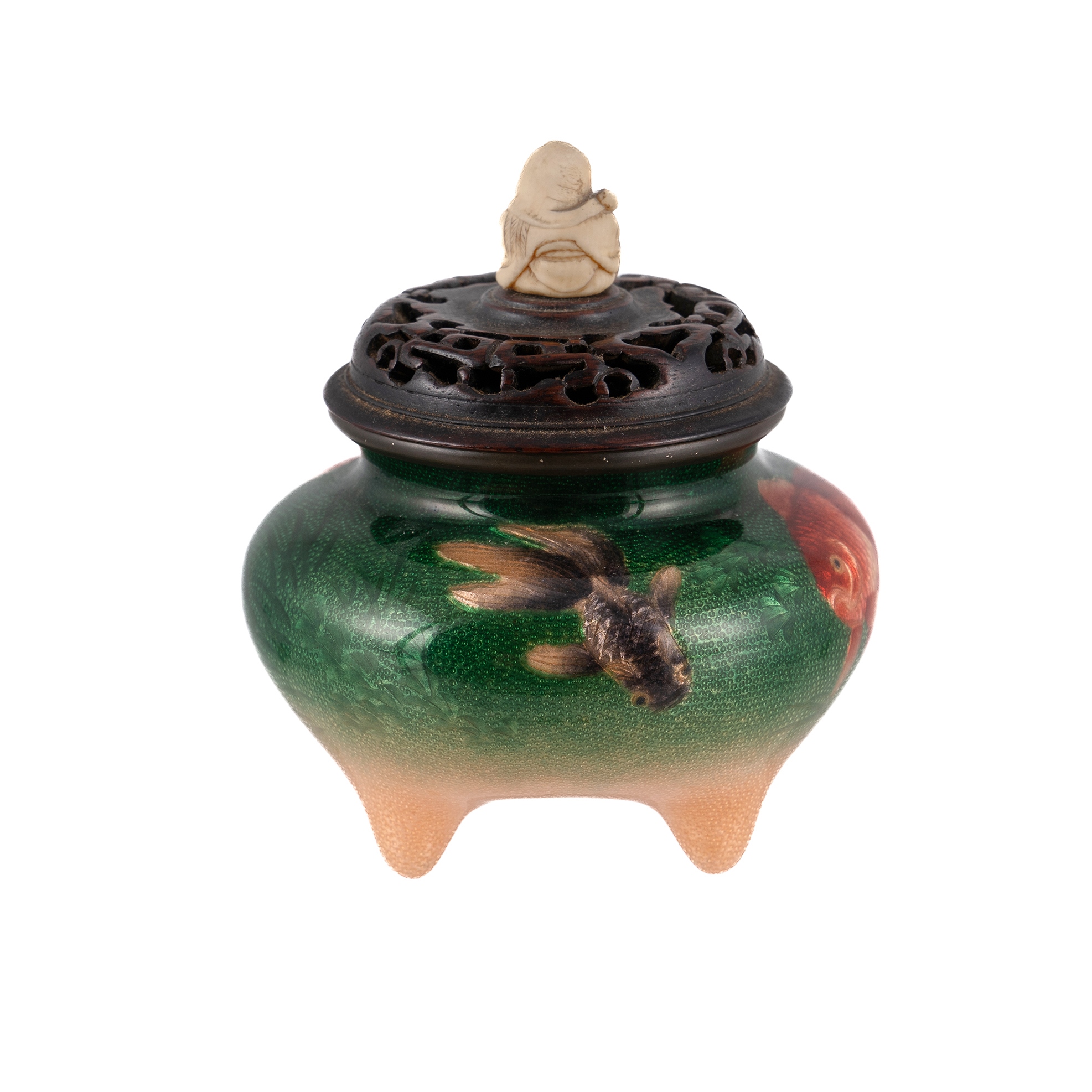 Japanese Ginbari Enamel Tripod Koro & Cover Green and peach ground with gold fish. Reticulated cover with ivory Daruma finial. NB: ivory export restrictions. (H19cm)Estimate $200-400