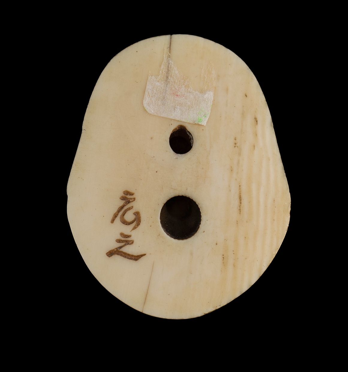 Japanese Ivory 'Okame' Mask Netsuke With ink stain detail. Signed. NB: ivory export restrictions. (H4cm)Estimate $200-400